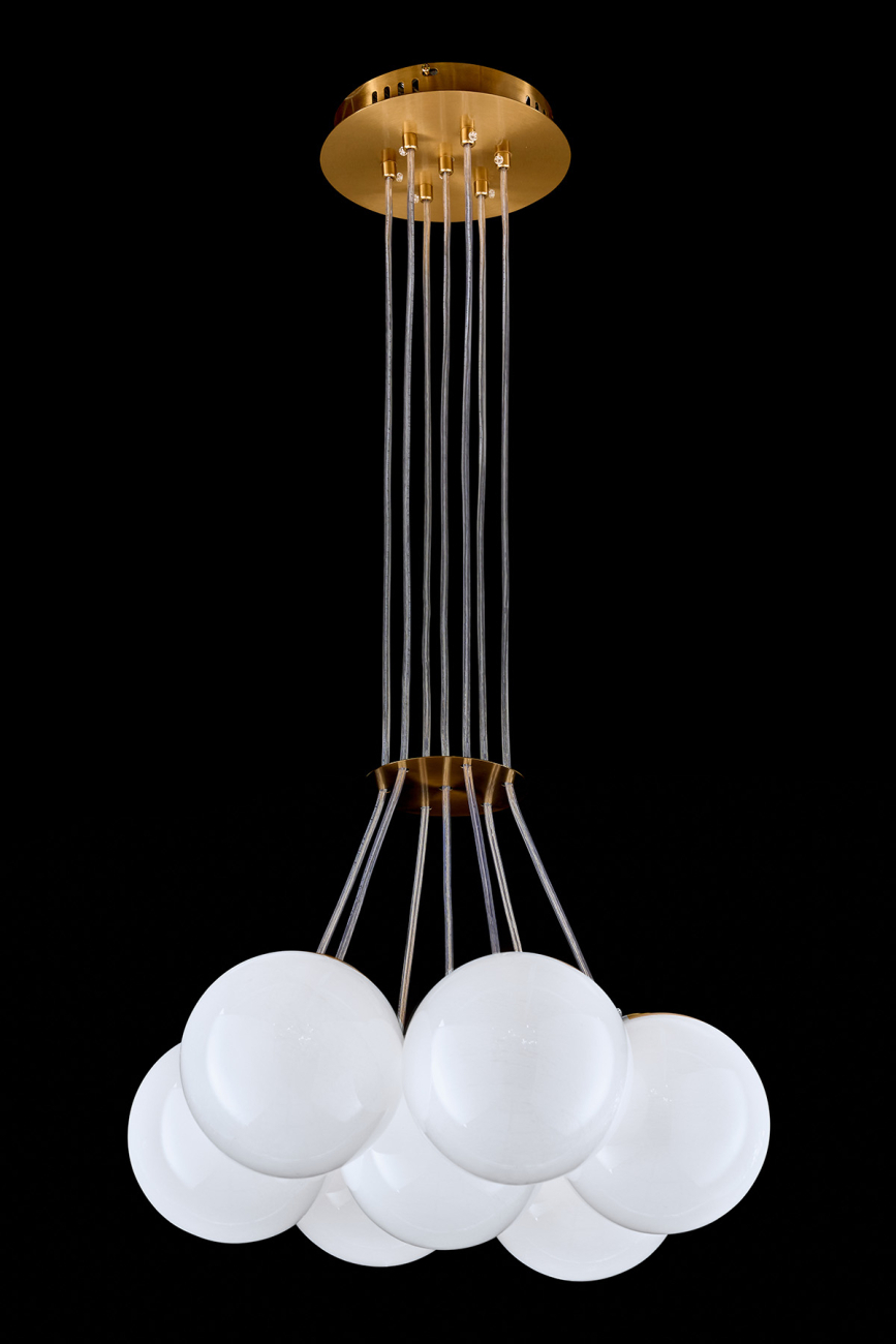 Допускается отличие страны-изготовителя, указанной в характеристиках. Линии производства могут находиться в нескольких государствах. Это не влияет на качество изготовления товара: все заводы данного бренда работают по общим стандартам, а готовые изделия проходят соответствующий контроль.Россия Коллекция Eve ЦветЦвет арматуры Латунь Цвет Латунь Материал арматуры Металл Цвет плафона Белый Материал плафона Стекло РазмерыВысота (мм) 1230 Длина (мм) 65 Диаметр (мм) 540 ЭлектрикаКоличество ламп (шт) 7 Цоколь G9 Дополнительная информацияВес (Кг) 3.9 -