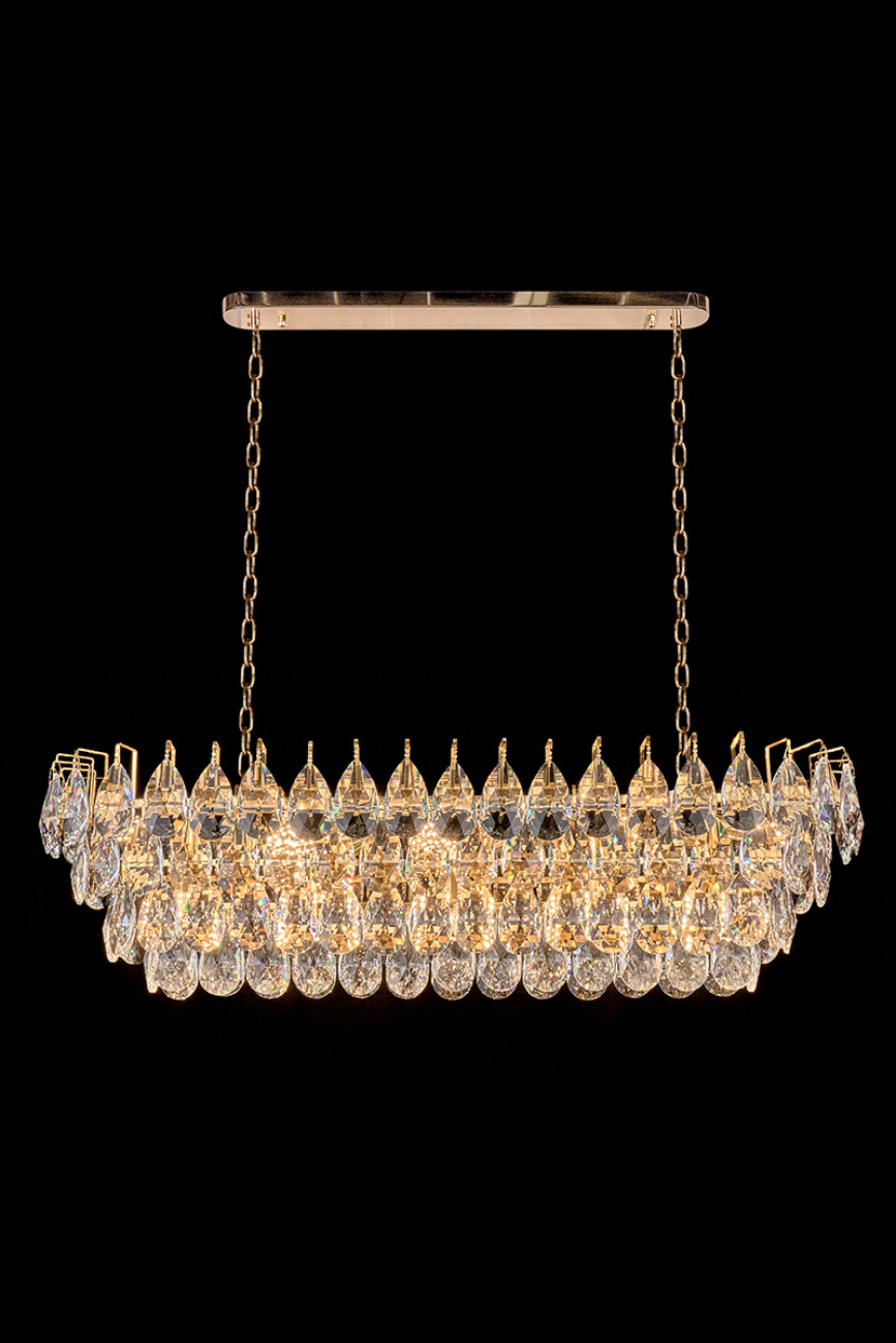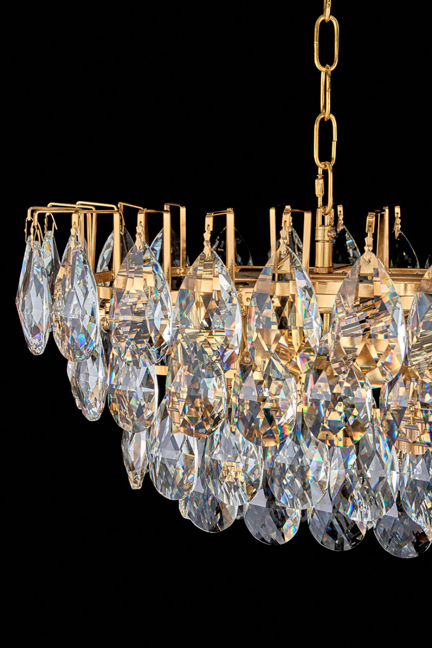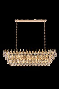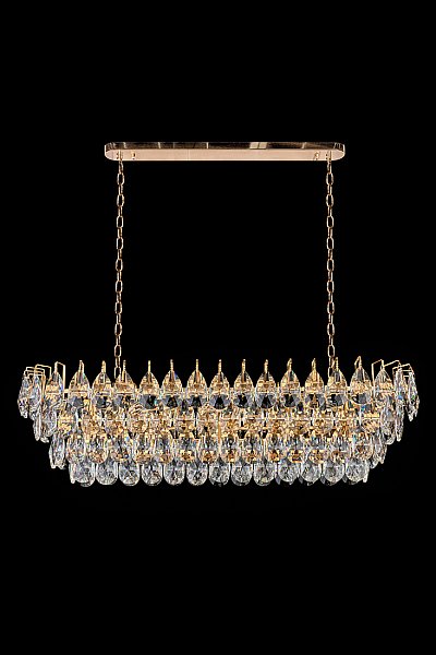 Допускается отличие страны-изготовителя, указанной в характеристиках. Линии производства могут находиться в нескольких государствах. Это не влияет на качество изготовления товара: все заводы данного бренда работают по общим стандартам, а готовые изделия проходят соответствующий контроль.Россия Коллекция Melanie ЦветЦвет арматуры Золото Цвет Золото Материал арматуры Металл гальванизированный Цвет плафона прозрачный Материал плафона Хрусталь РазмерыВысота (мм) 650 Длина (мм) 100 Ширина (мм) 350 ЭлектрикаКоличество ламп (шт) 15 Цоколь E14 Дополнительная информацияВес (Кг) 22.4 -