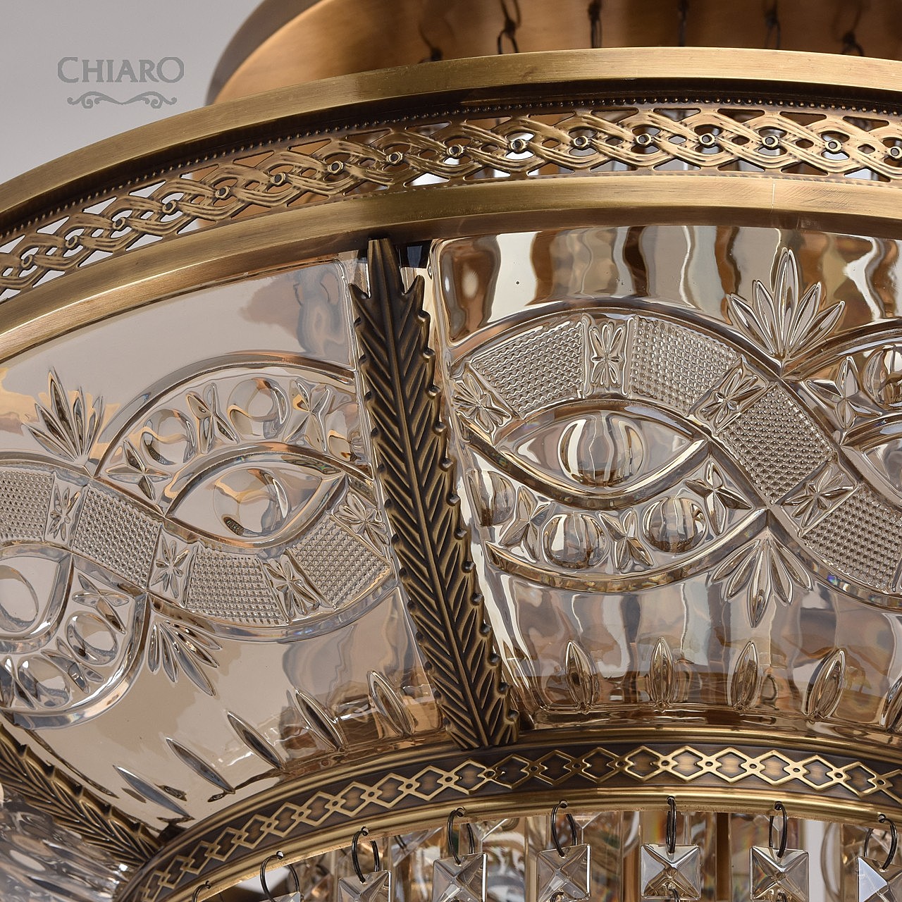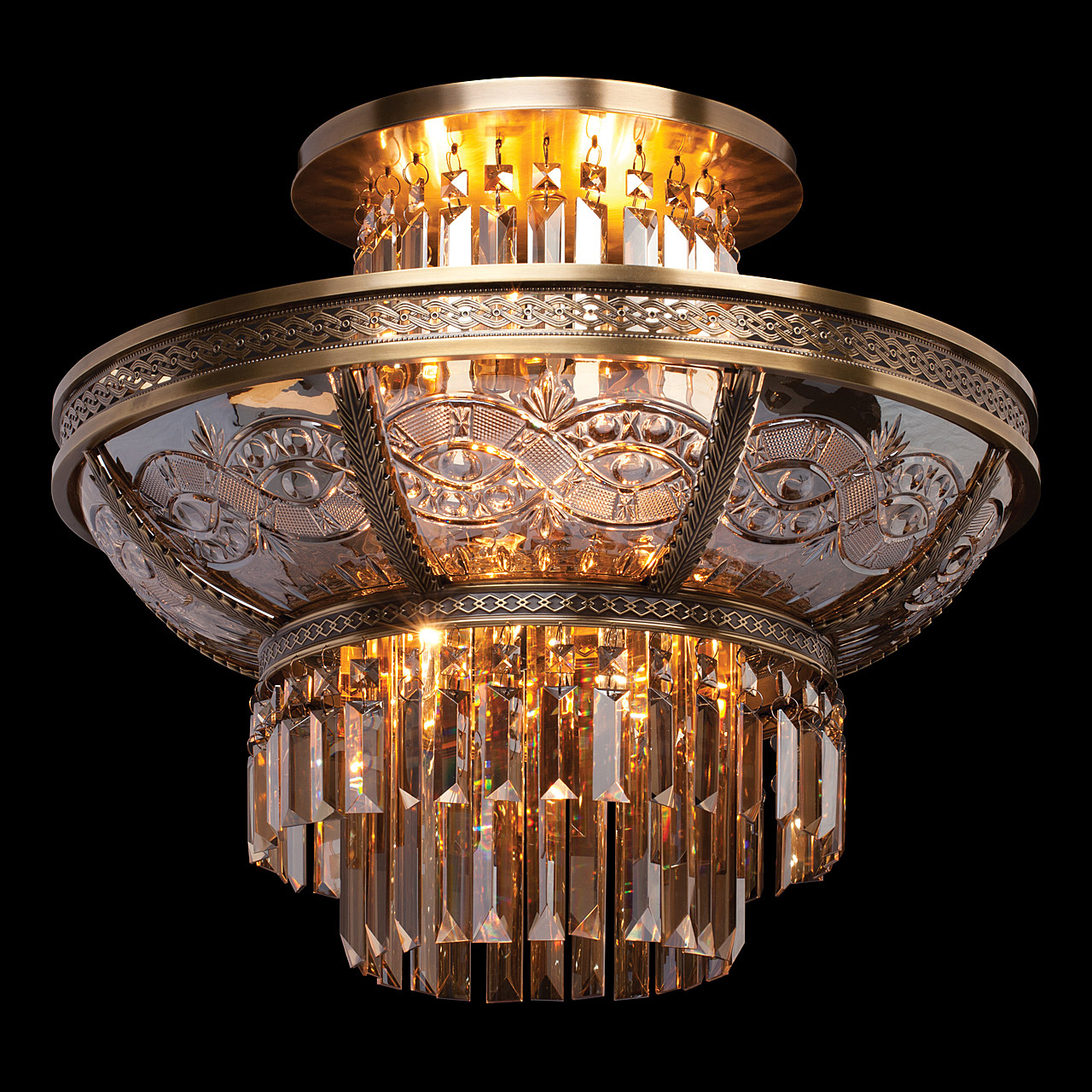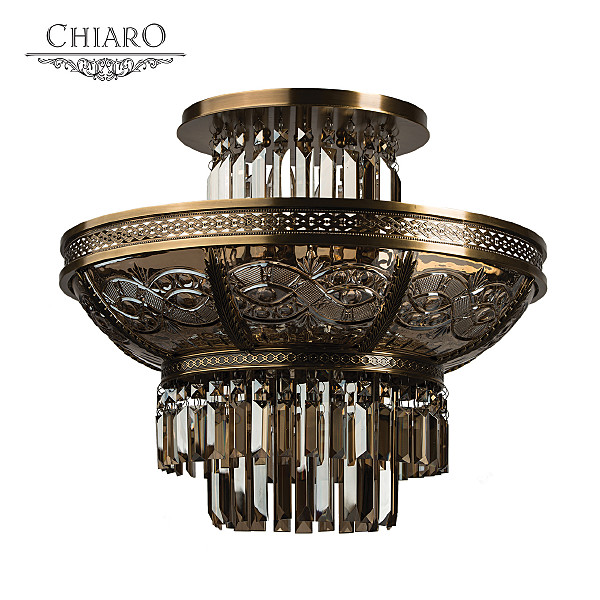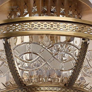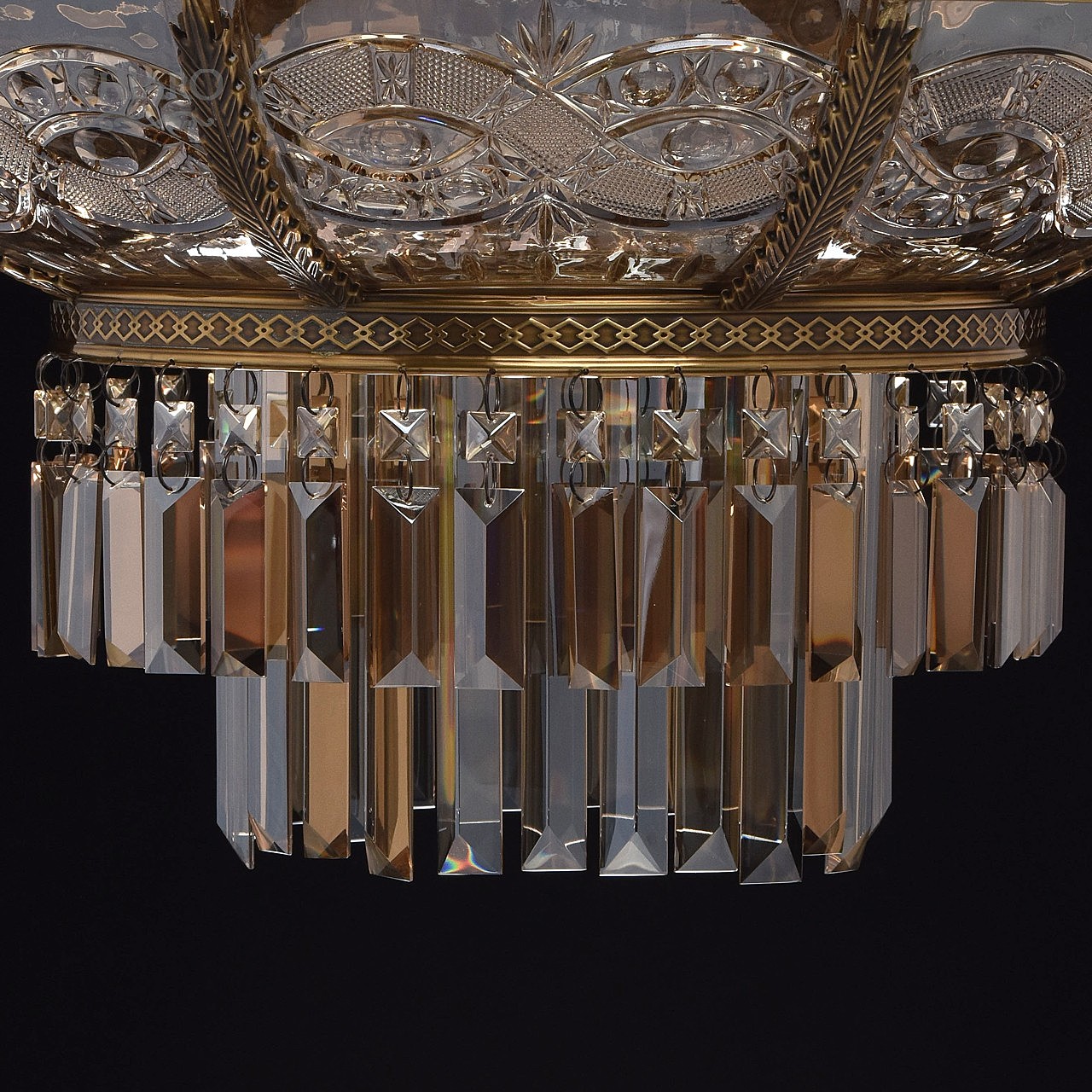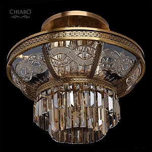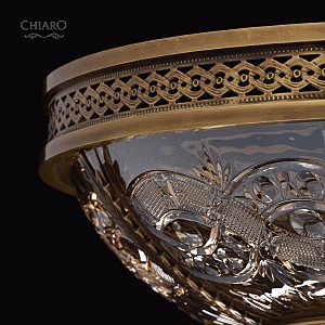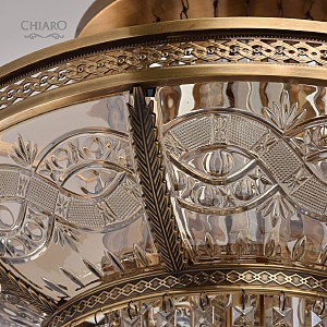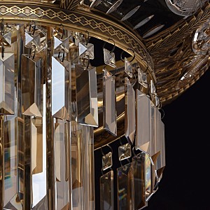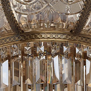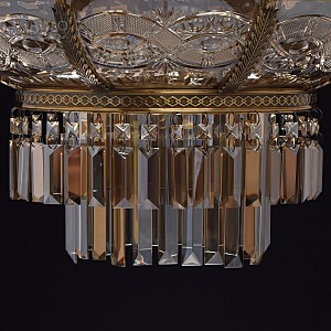 Классическая изысканность и яркий блеск граней хрусталя потолочного светильника Диана восхищает своей красотой и индивидуальностью! Стеклянный плафон выполнен в виде торжественной чаши с изумительным фактурным рисунком, который неповторимо преобразовывает лучи света в отблески, рассеивающие радужные блики в окружающем пространстве! Хрусталь классической прямоугольной формы располагается по центру композиции и создаёт строгую парадную форму. Стеклянные и хрустальные элементы в светильнике гальванизированы и представлены в янтарном цвете. Завершающим аккордом светильника Диана является качественное металлическое основание из латуни, элегантно подчеркивающее статусность добротного изделия.