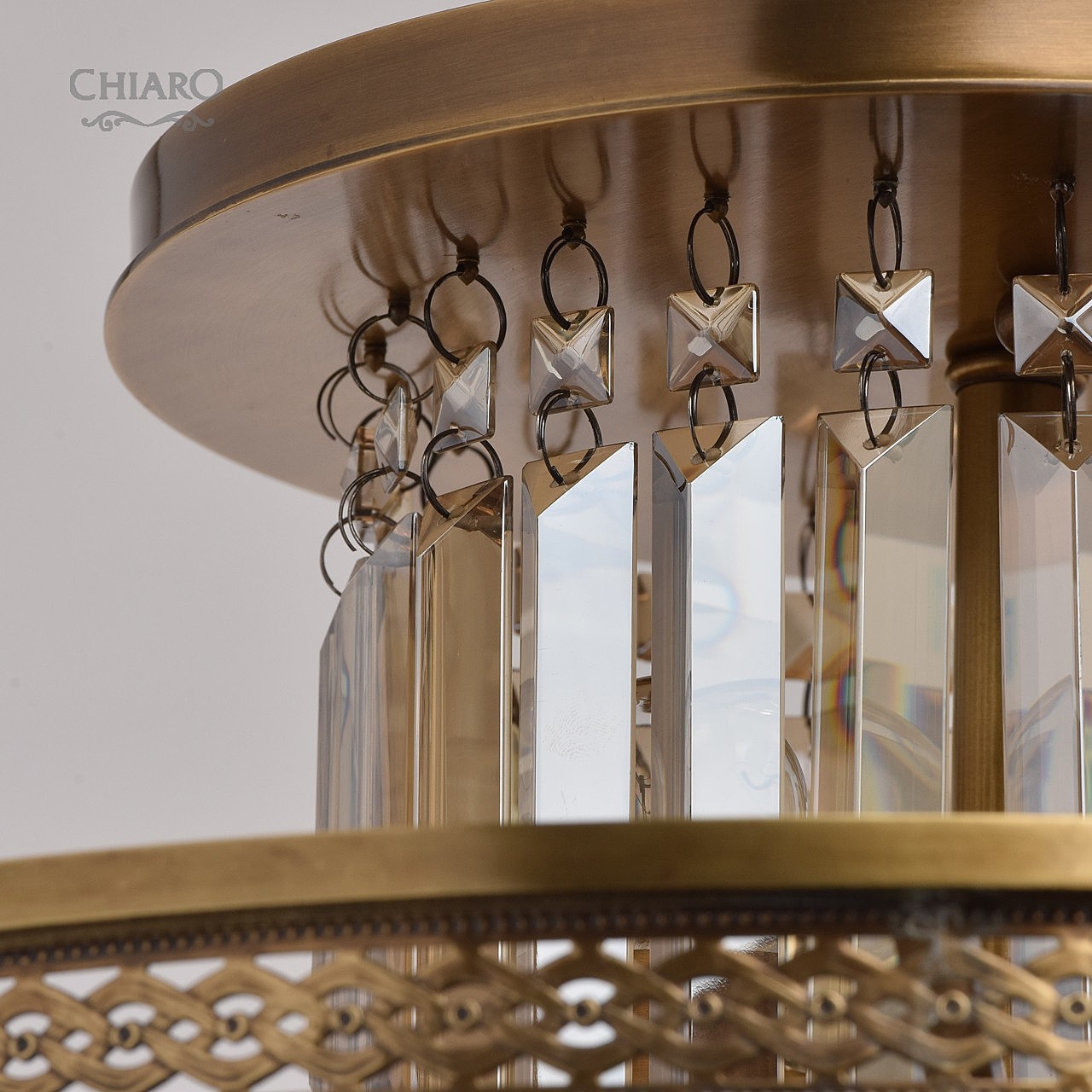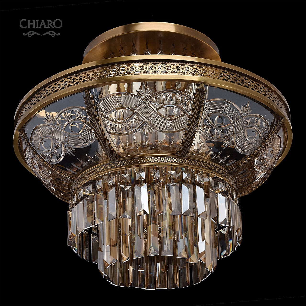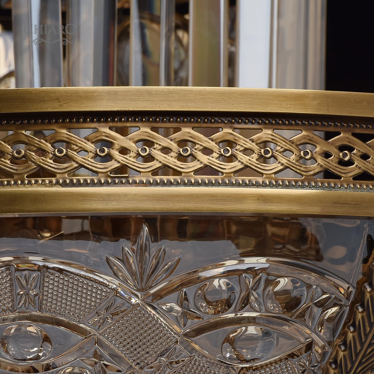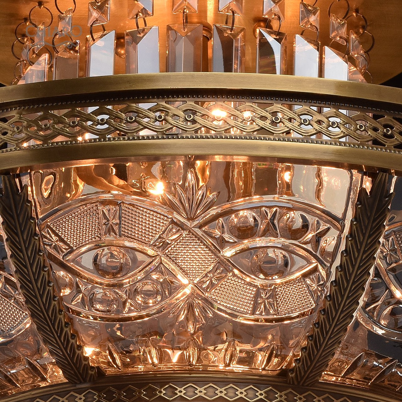 Классическая изысканность и яркий блеск граней хрусталя потолочного светильника Диана восхищает своей красотой и индивидуальностью! Стеклянный плафон выполнен в виде торжественной чаши с изумительным фактурным рисунком, который неповторимо преобразовывает лучи света в отблески, рассеивающие радужные блики в окружающем пространстве! Хрусталь классической прямоугольной формы располагается по центру композиции и создаёт строгую парадную форму. Стеклянные и хрустальные элементы в светильнике гальванизированы и представлены в янтарном цвете. Завершающим аккордом светильника Диана является качественное металлическое основание из латуни, элегантно подчеркивающее статусность добротного изделия.