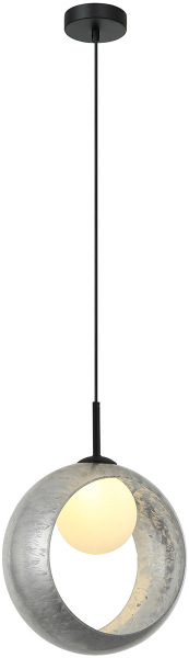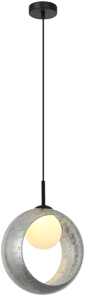 Светильник подвесной коллекциии RAUNDI выполнен из металла, окрашенного в черный цве,т и декорирован двумя стеклянными плафономи. Белый матовый плафон из стекла в форме сферы и декоративный стеклянный плафон в виде кольца окрашен в серебристый цвет. Индивидуальный рисунок ручной работы, имитирующий узоры инея, придаёт коллекции эксклюзивность. Премиальное качество и неповторимыи? дизаи?н светильников идеально подои?дут в современные и дизайнерские интерьеры.