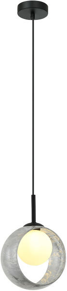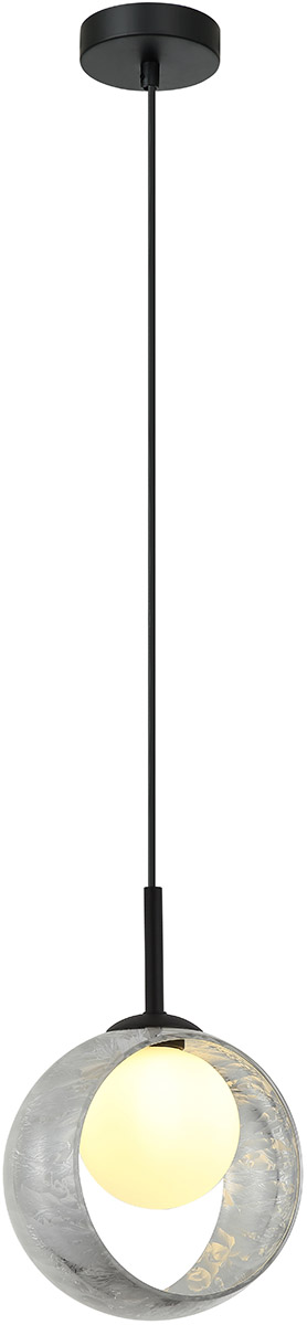 Светильник подвесной коллекциии RAUNDI выполнен из металла, окрашенного в черный цвет, и декорирован двумя стеклянными плафонами . Белый матовый плафон из стекла в форме сферы и декоративный стеклянный плафон в виде кольца окрашен в серебристый цвет. Индивидуальный рисунок ручной работы, имитирующий узоры инея, придаёт коллекции эксклюзивность Премиальное качество и неповторимыи? дизаи?н светильников идеально подои?дут в современные и дизайнерские интерьеры.