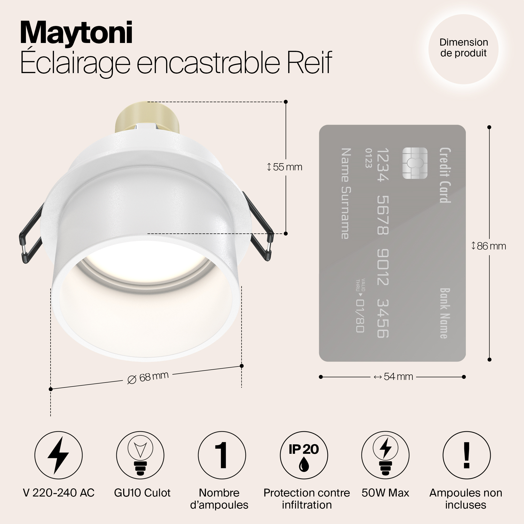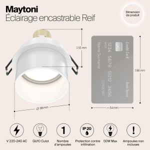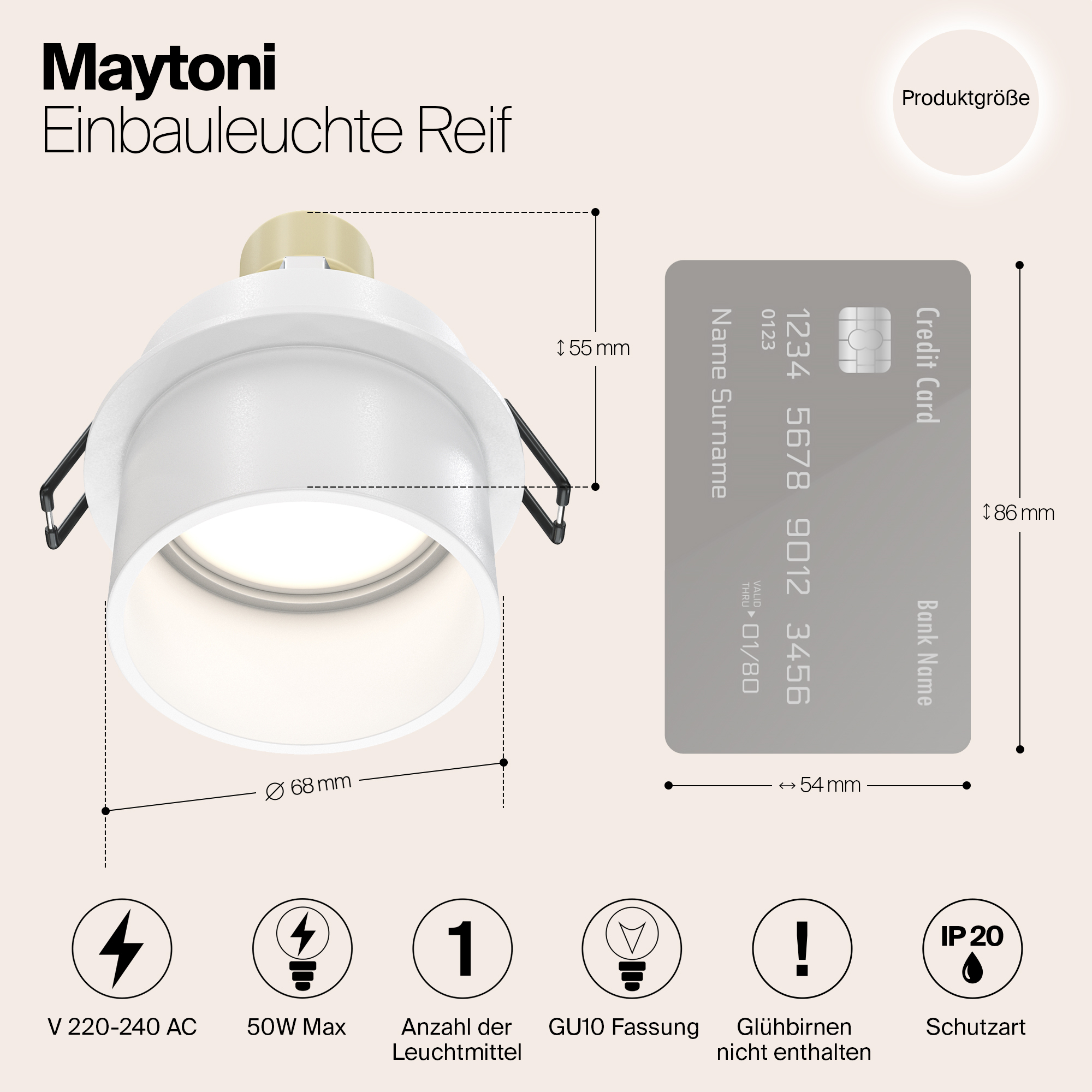 Допускается отличие страны-изготовителя, указанной в характеристиках. Линии производства могут находиться в нескольких государствах. Это не влияет на качество изготовления товара: все заводы данного бренда работают по общим стандартам, а готовые изделия проходят соответствующий контроль.Германия Коллекция Reif ЦветЦвет арматуры Белый Цвет Белый Материал арматуры Алюминий РазмерыВысота (мм) 55 Диаметр (мм) 68 Высота минимальная (мм) 55 Ширина (мм) 68 Диаметр врезного отверстия (мм) 65 ЭлектрикаКоличество ламп (шт) 1 Цоколь GU10 Мощность лампы (Вт) 10 Напряжение (В) 220 Дополнительная информацияСтепень защиты (IP) IP20 Вес (Кг) 0,08 -