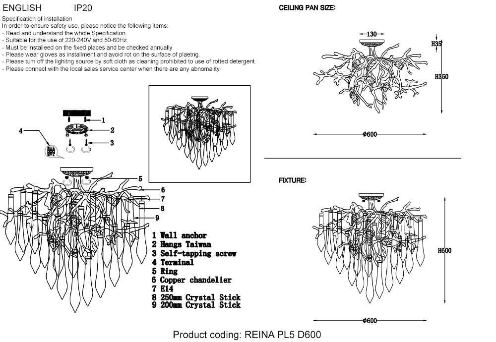 Допускается отличие страны-изготовителя, указанной в характеристиках. Линии производства могут находиться в нескольких государствах. Это не влияет на качество изготовления товара: все заводы данного бренда работают по общим стандартам, а готовые изделия проходят соответствующий контроль.Испания Коллекция Reina ЦветЦвет арматуры Серебро Цвет Серебро Материал арматуры Латунь Материал декора Стекло РазмерыВысота (мм) 950 Диаметр (мм) 600 Высота минимальная (мм) 600 Ширина (мм) 600 ЭлектрикаКоличество ламп (шт) 5 Цоколь E14 Мощность лампы (Вт) 60 Дополнительная информацияСтепень защиты (IP) 20 -