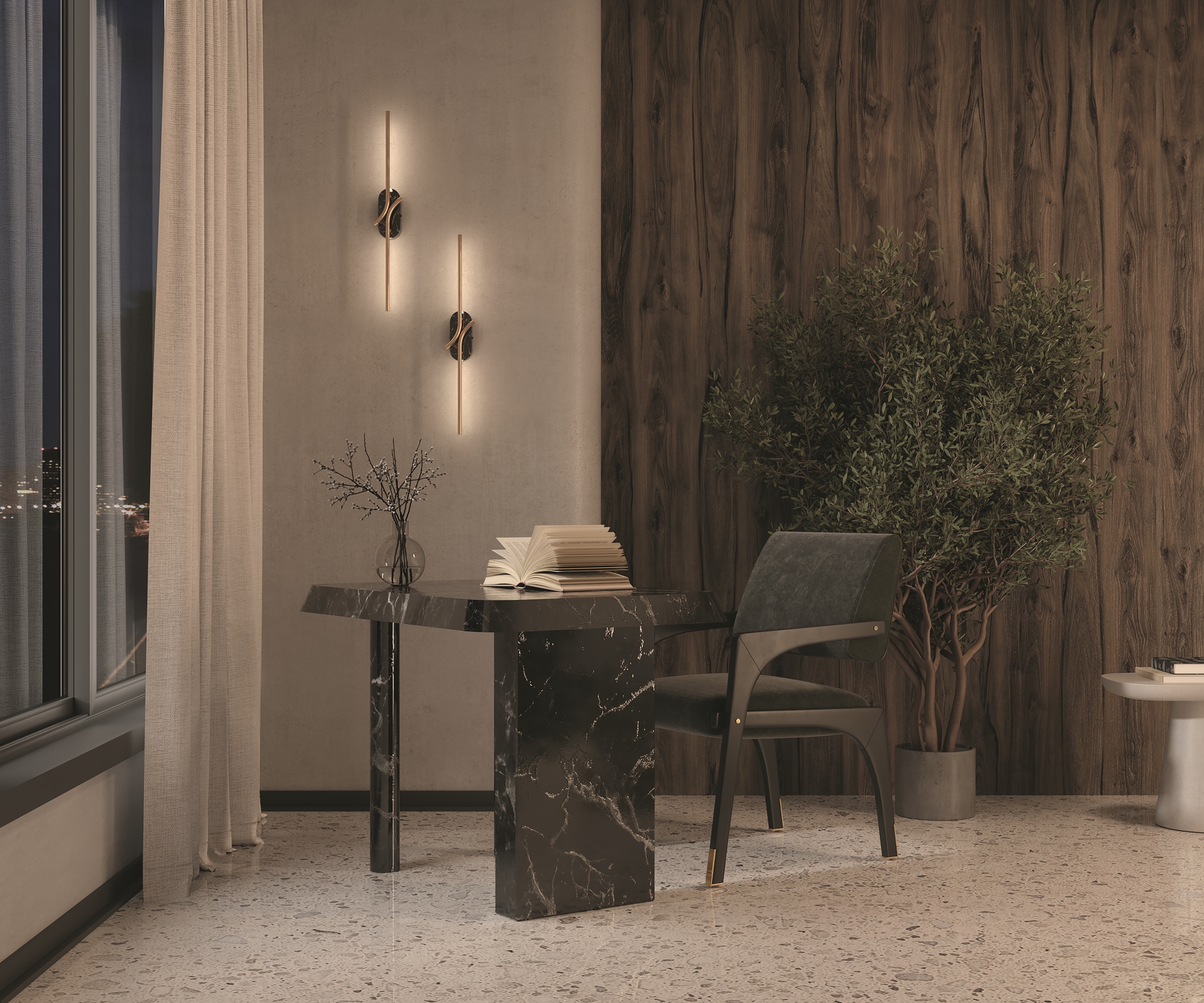 Два варианта основания корпуса. Металлический, цвета - черный и сатинированная латунь. Мрамор, цвета - черный и серый. Плафон-трубка из металла со скрытым рассеивателем. Серия отражает эстетические чувства эпохи Возрождения, искусно сочетая цветовые палитры, формы и материалы, характерные для того периода. LED источник света. Цветовая температура - 3000К.