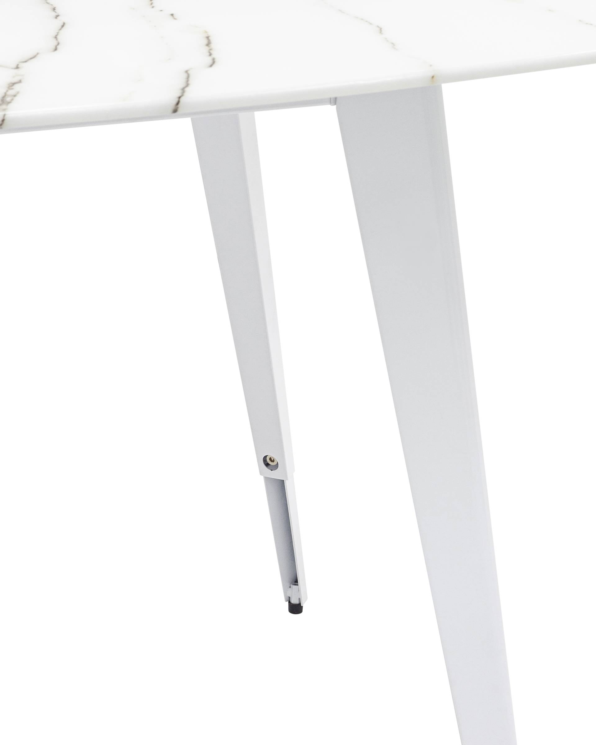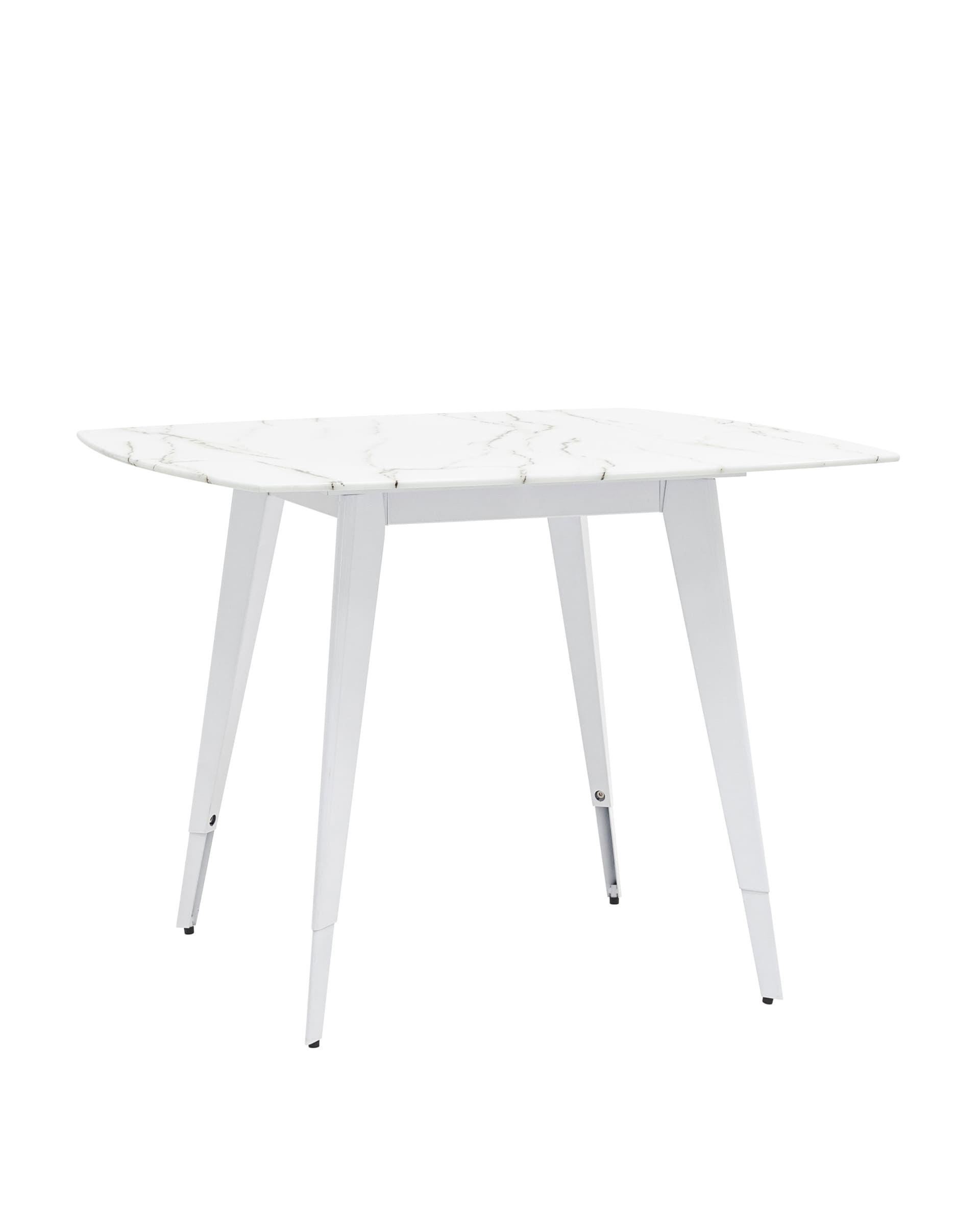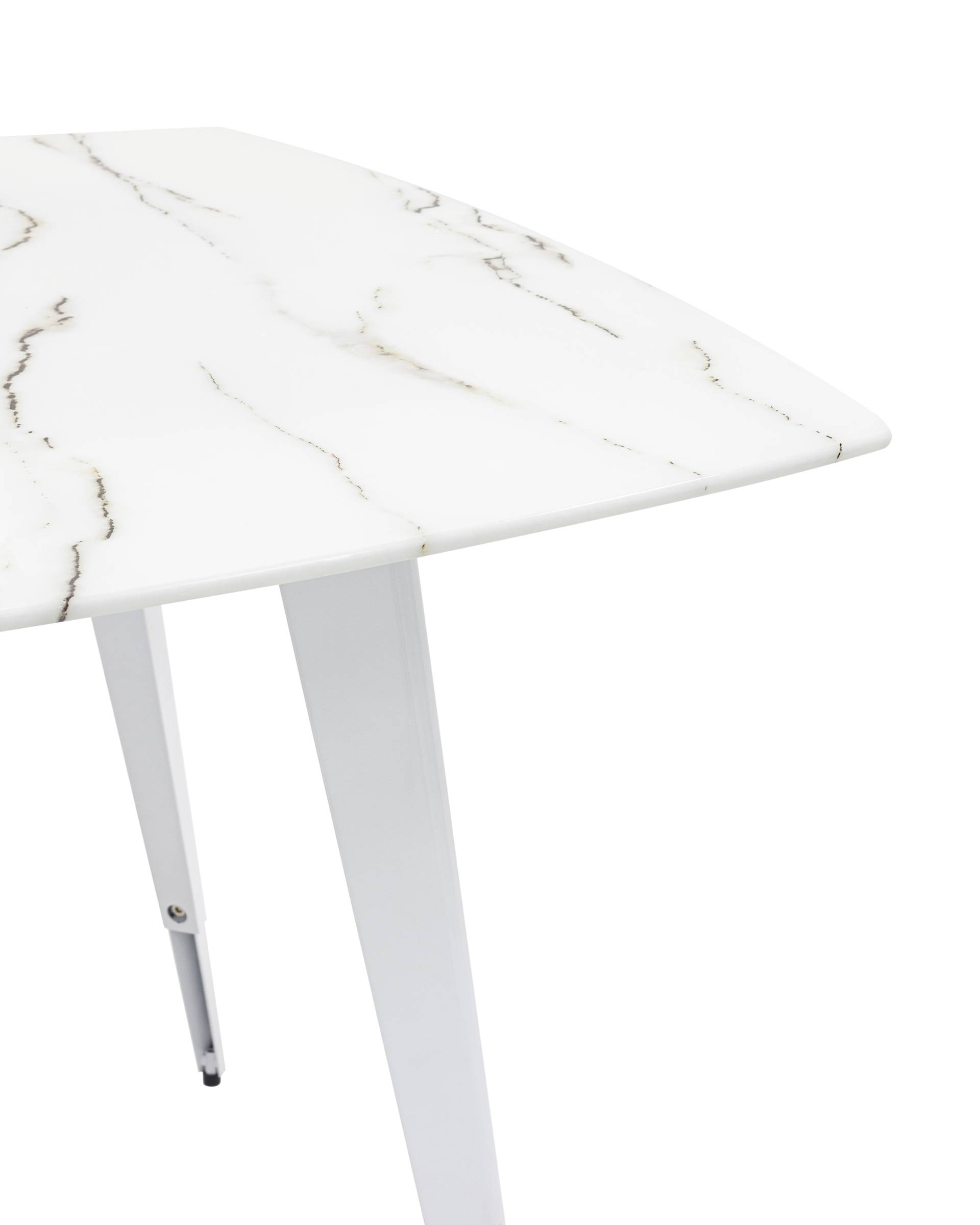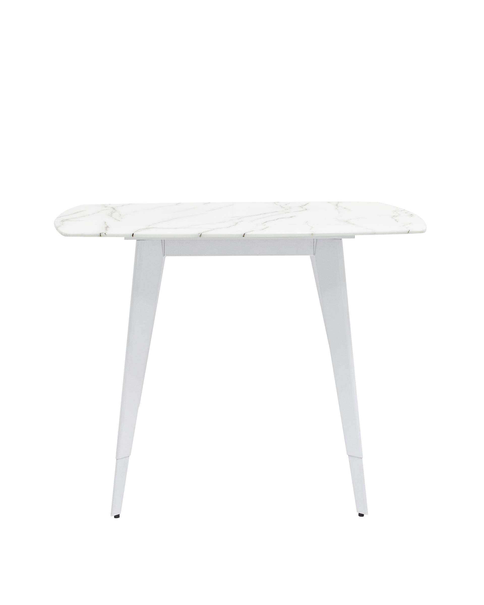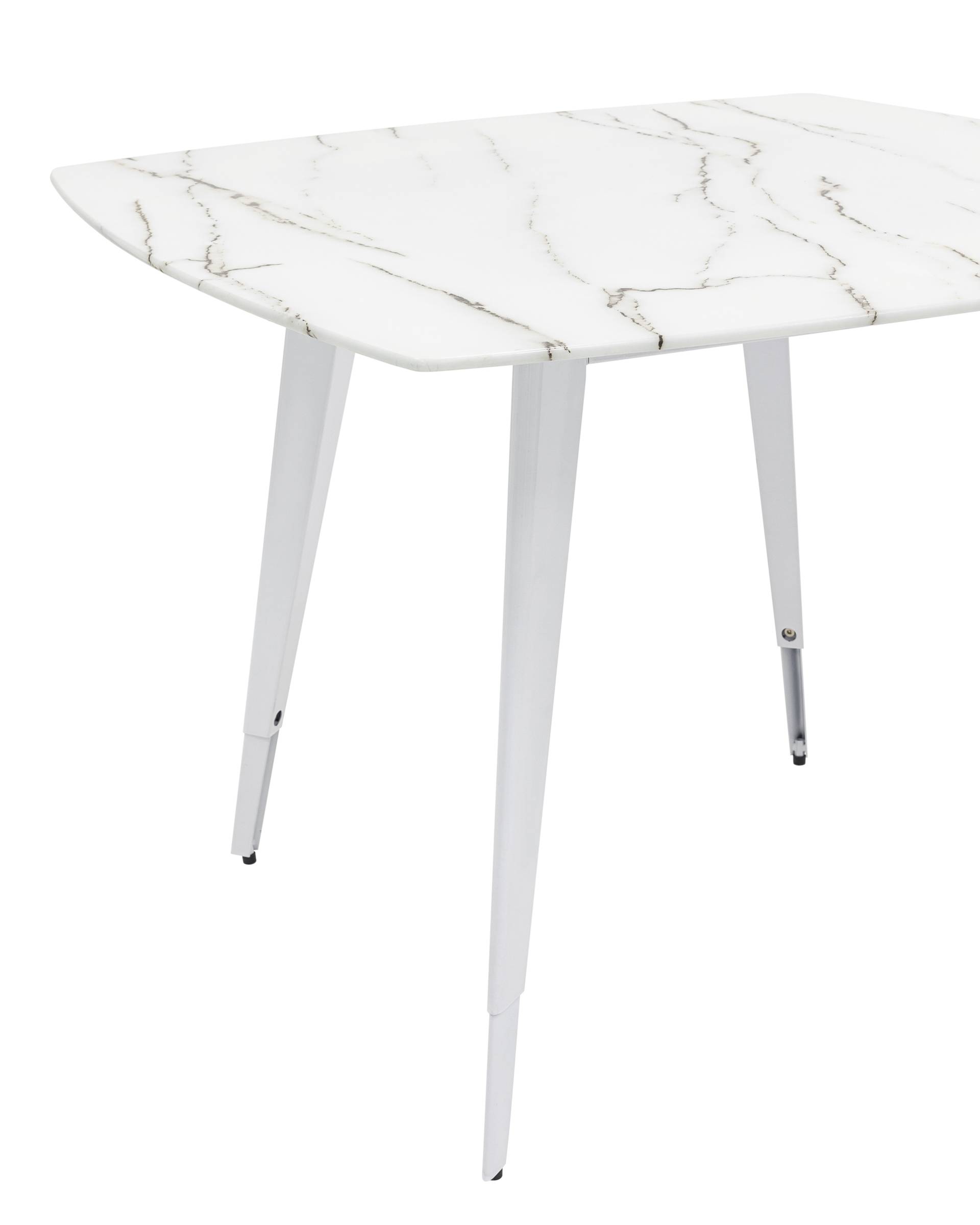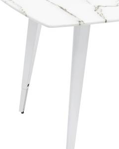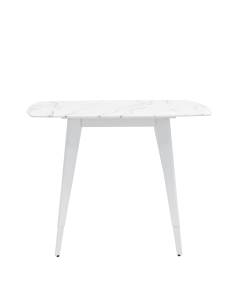 <p>Обеденный стол с красивой стеклянной столешницей белого цвета с рисунком под мрамор.</p><p>Такое сочетание эффектно смотрится в любом интерьере.</p><p>Ножки стола изготовлены из металла, размеры столешницы 100*100 см.</p>