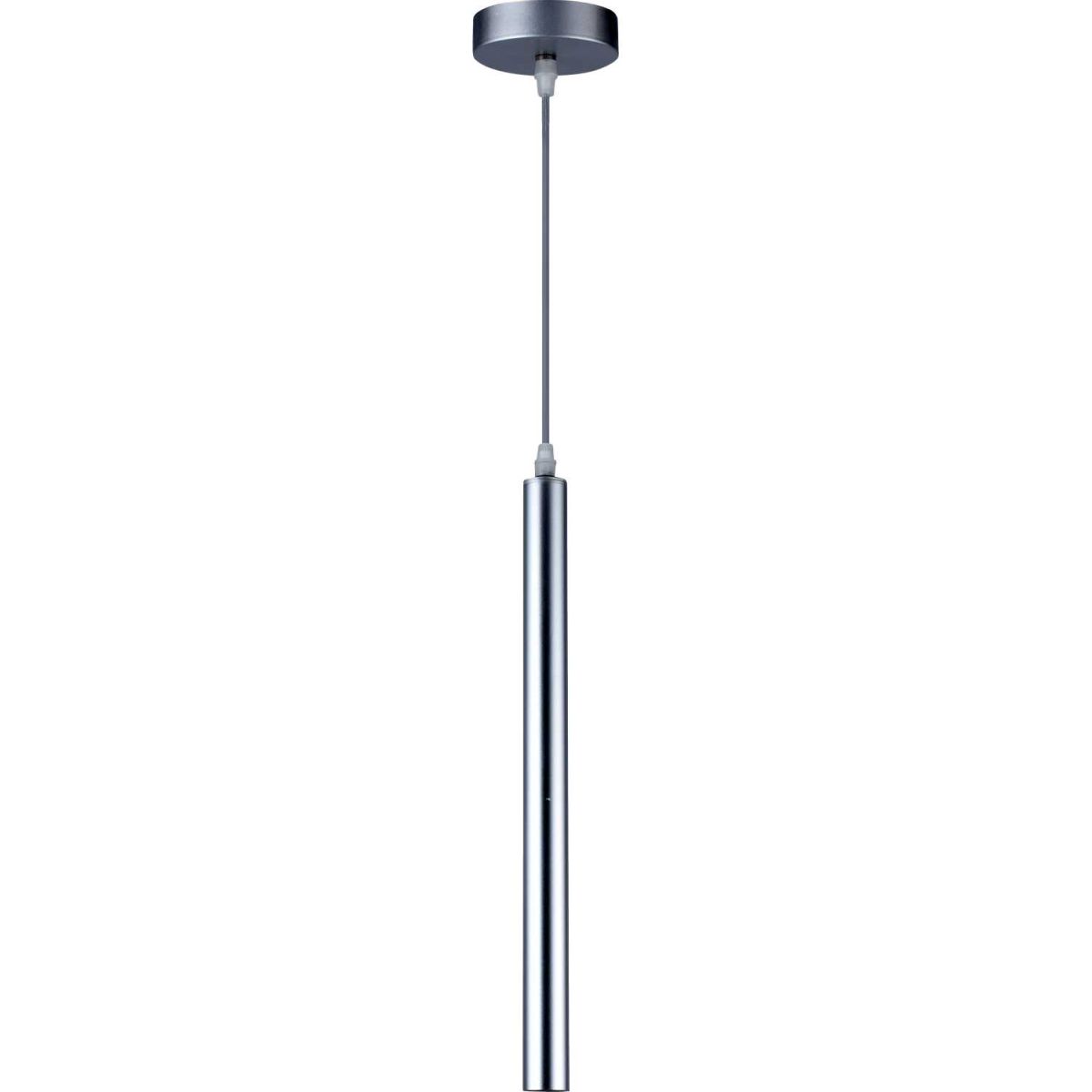 Светильник подвесной из коллекции Rodeo выполнен из металла, гальванизированного в цвет хрома, и металлический плафон, также гальванизированный в цвет хрома. Источник света закрыт белым матовым акрилом.