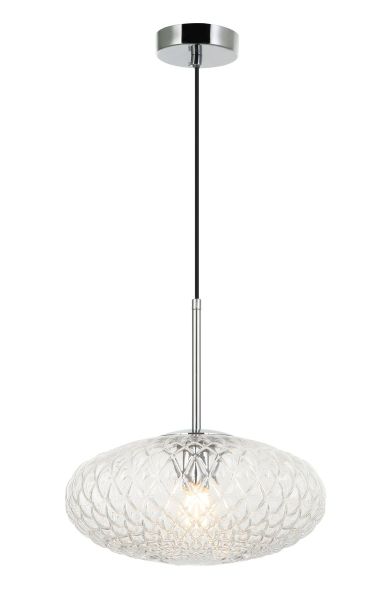 Светильник подвесной из коллекции Roxie выполнен из металла, гальванизированного в цвет хрома, и декорирован плафоном овальной формы из прозрачного фактурного градуированного стекла.