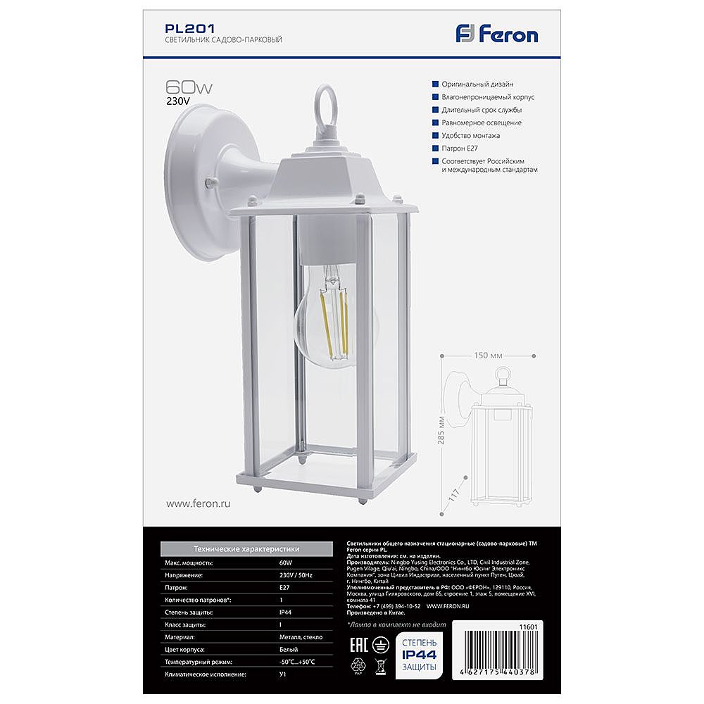 Светильник садово-парковый, серии "Санторини" (НБУ) FERON PL201 1*60W, E27, 230V, IP44, цвет белый, 4-х гранник, на стену вниз, 117*150*285мм