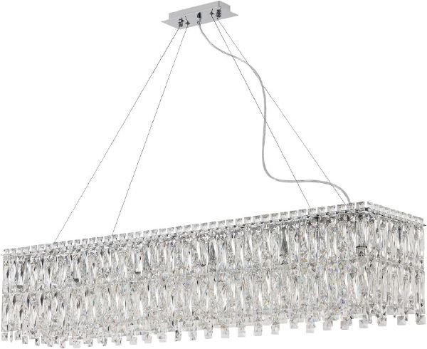 Люстра подвесная вытянутой формы из коллекции Santorini выполнена из металkической арматуры, гальванизированной в цвет хрома, и декорирована узкими прямоугольными подвесками из хрусталя высшего качества. Современная форма и высокое качество светильников идеально подойдут как в классические, так и современные интерьеры. Из данной коллекции светильников можно сделать индивидуальный заказ любого цвета и размера.