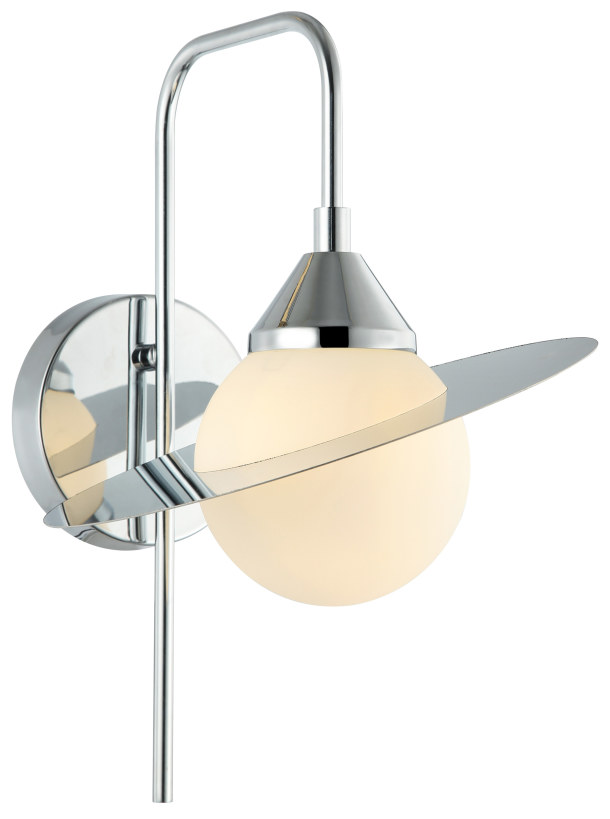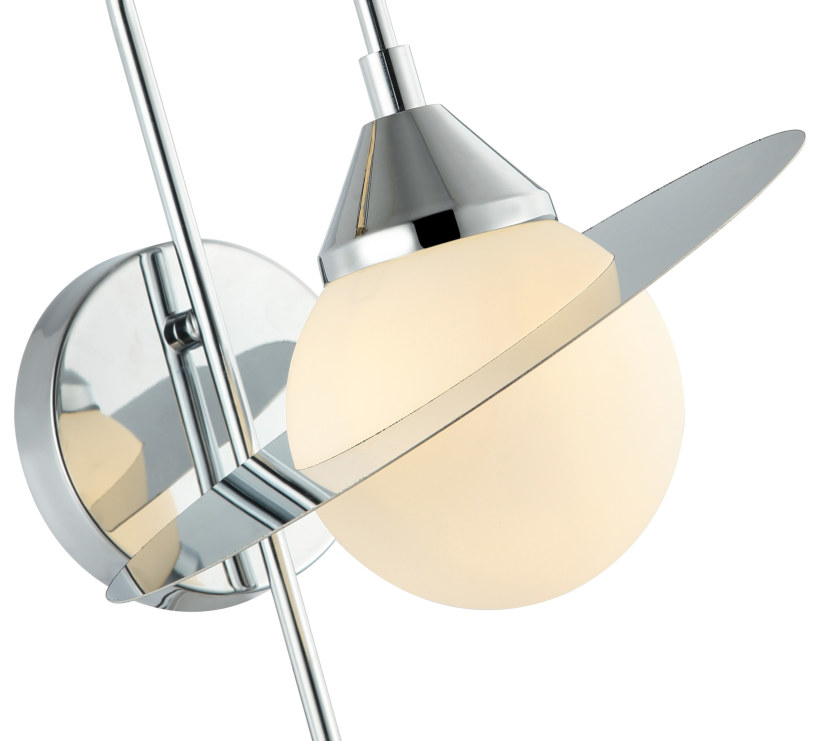 Светильник настенный из коллекции Saturn выполнен из металла, гальванизированного в цвет хрома, и декорирован круглым белым матовым плафоном. Для декора плафона используется пластина из нержавеющей стали, отполированная до зеркального блеска, и напоминающая орбиту Сатурна. Пластина лежит свободно, благодаря чему может менять направление отражения глянцевых дисков. Премиальное качество и неповторимыи? дизаи?н светильников идеально подои?дут в современные и дизайнерские интерьеры.