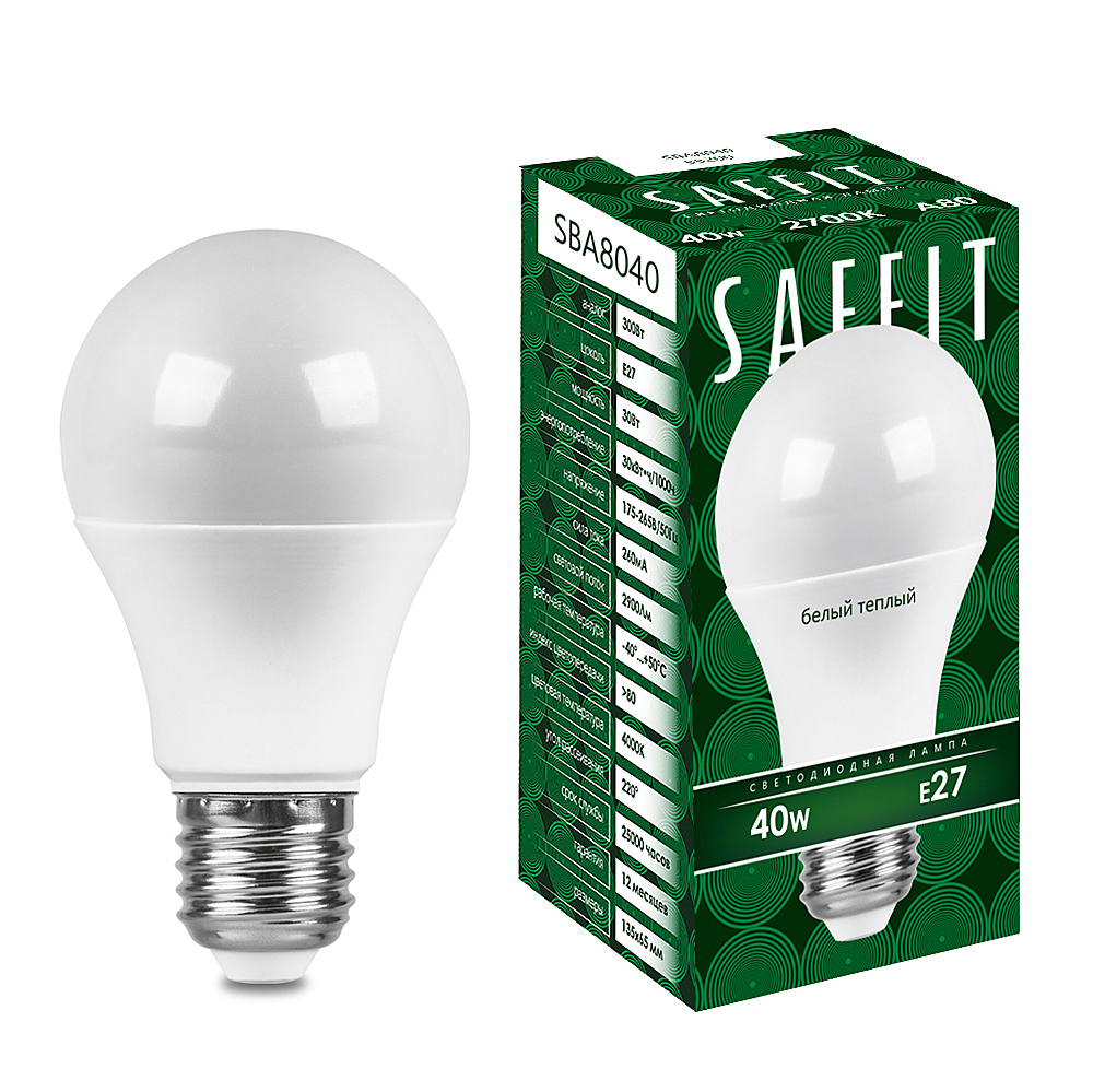 Лампа светодиодная SAFFIT SBA8040, A80 (шар), 40W 230V E27 2700К (белый теплый), рассеиватель матовый белый, 3600Lm, угол рассеивания 220градусов, 148*80мм