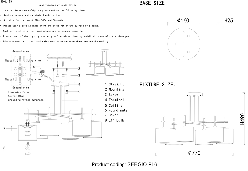 Допускается отличие страны-изготовителя, указанной в характеристиках. Линии производства могут находиться в нескольких государствах. Это не влияет на качество изготовления товара: все заводы данного бренда работают по общим стандартам, а готовые изделия проходят соответствующий контроль.Испания Коллекция Sergio ЦветЦвет арматуры Никель Цвет Никель Материал арматуры Металл Цвет плафона серебряный Материал плафона Текстиль, Пластик РазмерыВысота (мм) 490 Диаметр (мм) 770 Высота минимальная (мм) 490 Ширина (мм) 770 ЭлектрикаКоличество ламп (шт) 6 Цоколь E14 Мощность лампы (Вт) 60 Дополнительная информацияСтепень защиты (IP) 20 -