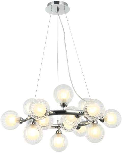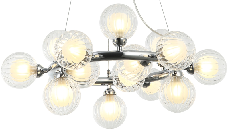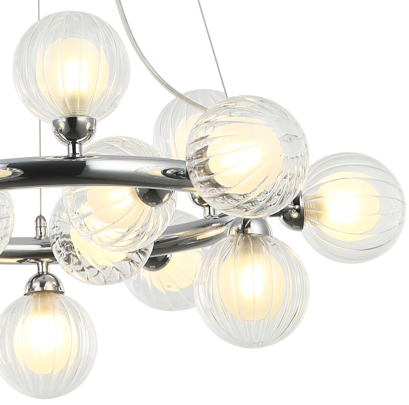 Люстра подвесная из коллекции Shardin выполнена из металла, гальванизированного в цвет хрома, и декорирована двойными плафонами из прозрачного внешнего стекла с линейным рисунком и внутреннего белого матового.
