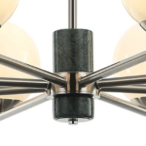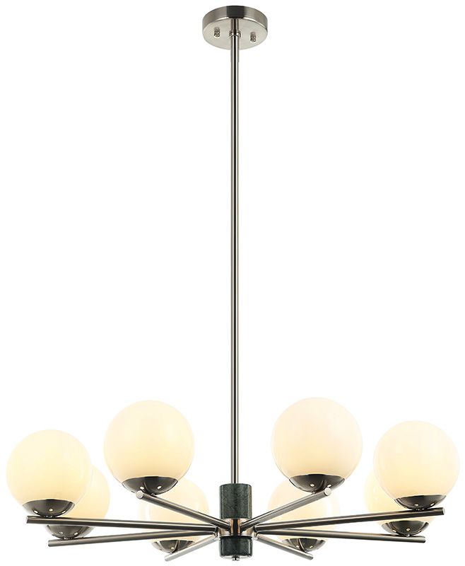 Люстра на штанге из коллекции Sharo выполнена из металла, гальванизированного в цвет никеля, и декорирована натуральным мрамором. Источники света закрыты белыми глянцевыми плафонами. Премиальное качество и неповторимыи? дизаи?н светильников идеально подои?дут как в классические, так и современные дизайнерские интерьеры.