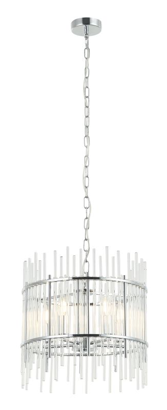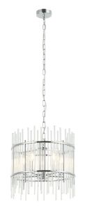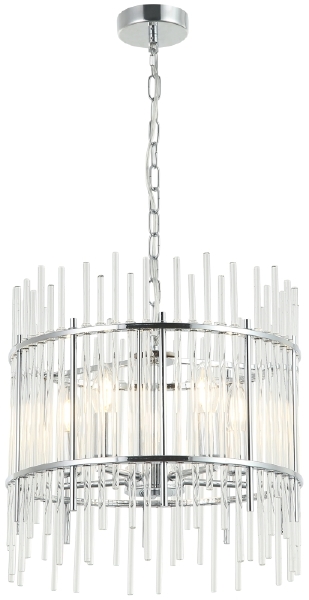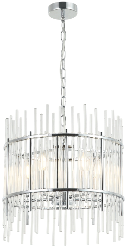 Люстра подвесная из коллекции Sia выполнена из металла, гальванизированного в цвет хрома, и декорирована прозрачными стеклянными трубочками. Каркас люстры отделан металлическими кантами и дополнительно закрепленными металлическими стержнями, гальванизированными в цвет арматуры.