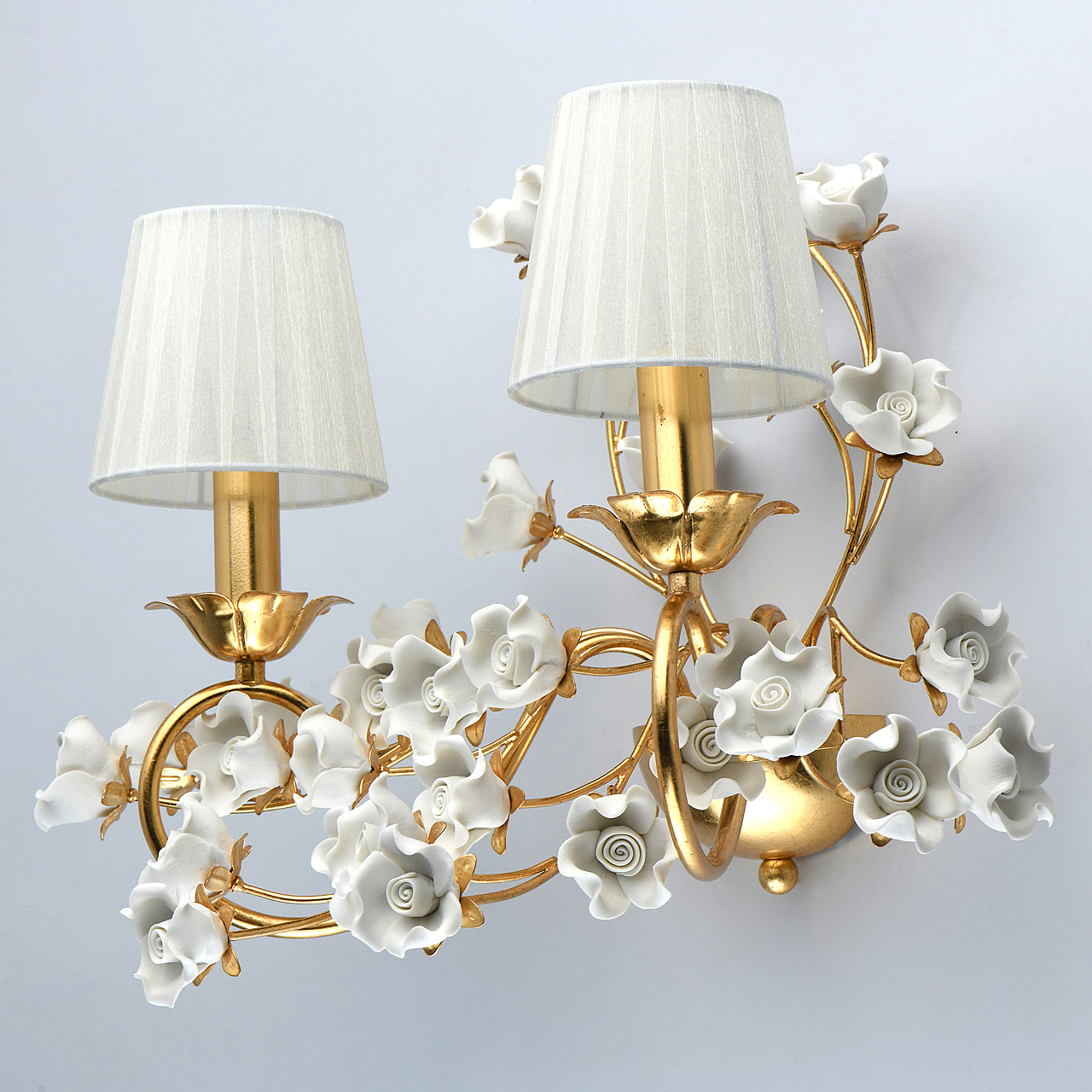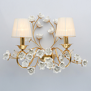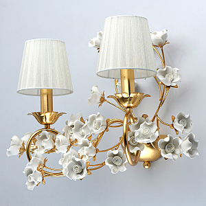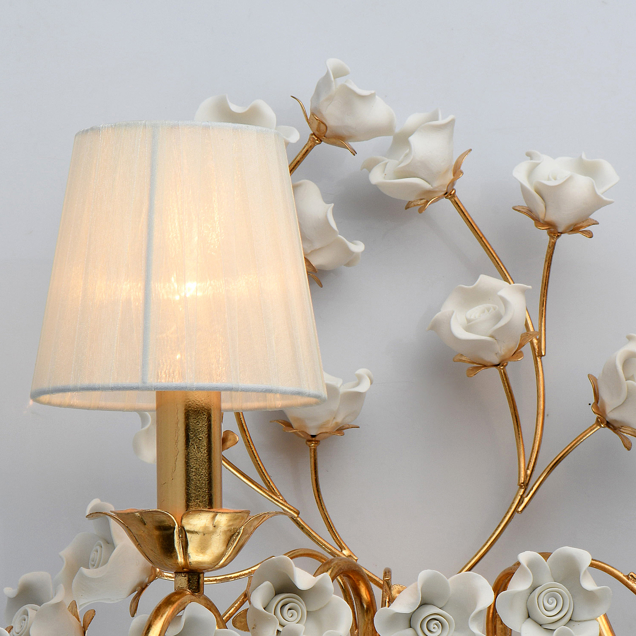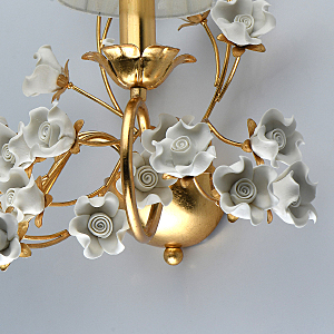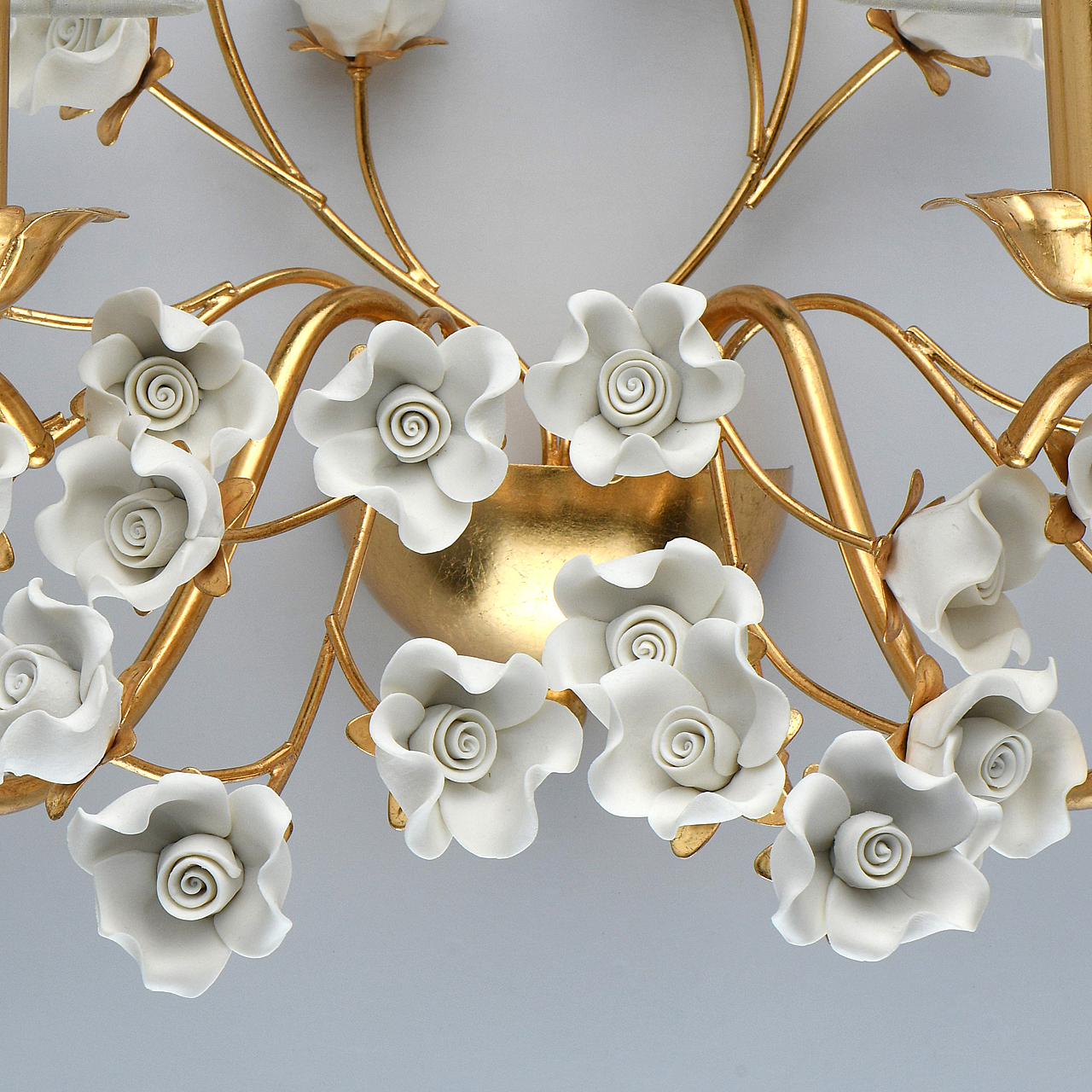 Флористический декор из керамики ручной работы.Покрытие сусальным золотом основания светильникаСъемные абажуры из прозрачной органзы обеспечивают мягкий световой поток.Возможность регулировать высоту светильника за счет звеньев цепи.