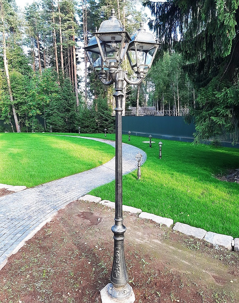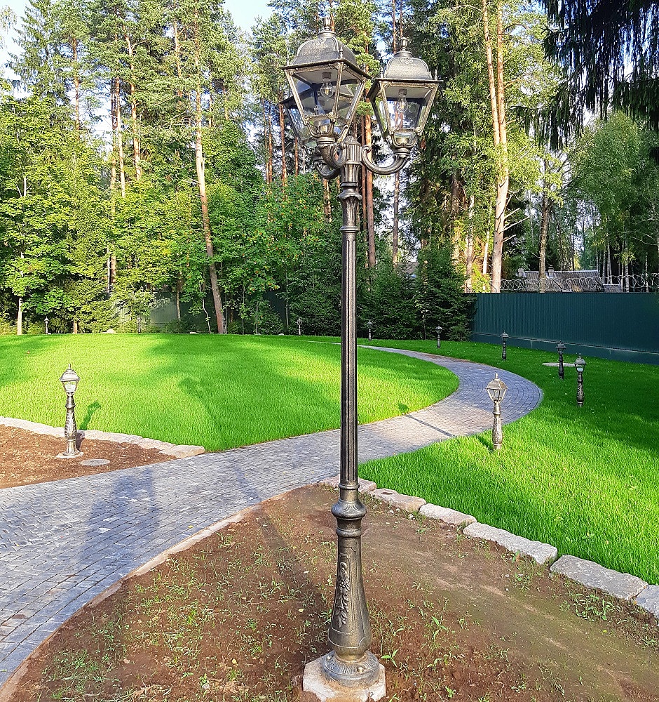 Парковый фонарь FUMAGALLI большого размера серии SIMON, модель NEBO OFIR/SIMON 3L. Парковый фонарь с 3 светильниками большого размера, на консолях OFIR среднего размера, установленных на классическом столбе NEBO высотой 2,5 м (+высота фонарей на кронштейнах). Изготовлены в Италии, по уникальным технологиям "FUMATECH" из современного композитного полимера RESIN. Этот материал в 5 раз прочнее металла, не ржавеет, не окисляется, не выгорает на солнце, его не нужно красить. Все светильники пыле-влаго защищены по стандарту IP55 (Пылезащищенные, защита от водяных струй с любого направления). Рассеиватель выполнен из антивандального, не мутнеющего и не горючего PMMA (ПолиМетилМетаАкрилат). Срок службы светильника - не менее 20 лет. Температура использования от -60 до +90. В серии SIMON есть садовые фонари в настенном (OFIR/SIMON, MIRRA/SIMON) подвесном (SICHEM/SIMON) и наземном исполнении (IAFAET.R/SIMON, ALOE.R/SIMON, ARTU/SIMON, GIGI/SIMON, RICU/SIMON, NEBO/OFIR/SIMON 1L, NEBO/OFIR/ANNA 2L, TABOR/ADAM/SIMON 3L) со столбами разной высоты, с разным количеством и конфигурацией голов. Консоли настенных фонарей и кронштейны светильников на столбах освещения могут устанавливаться в положение вверх и вниз. Столбы выше 150 см имеют в основе мощную стальную трубу с двойной оцинковкой. При заказе требуется выбрать цвет корпуса, цвет плафона и тип патрона (Е-27 или LED GX-53). Возможен светодиодный вариант. По стилю и дизайну серия уличных светильников SIMON похожа на светильники среднего размера серии CEFA. По размеру относится к большим парковым светильникам как серия NOEMI и GLOBE 400.