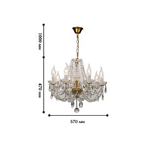 Допускается отличие страны-изготовителя, указанной в характеристиках. Линии производства могут находиться в нескольких государствах. Это не влияет на качество изготовления товара: все заводы данного бренда работают по общим стандартам, а готовые изделия проходят соответствующий контроль.Германия Коллекция Simone ЦветЦвет арматуры Золото Цвет Золото Материал арматуры Металл, Стекло Материал декора Хрусталь, Стекло РазмерыВысота (мм) 1470 Диаметр (мм) 570 Высота минимальная (мм) 470 Ширина (мм) 570 ЭлектрикаКоличество ламп (шт) 8 Цоколь E14 Мощность лампы (Вт) 40W Напряжение (В) 220 Дополнительная информацияВес (Кг) 5,8 Тип подвеса На цепи -