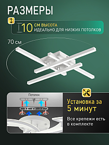 Люстра потолочная светодиодная с пультом ДУ от бренда Natali Kovaltseva представляет собой современное и функциональное решение для освещения вашего дома. Светильник выполнен в стиле хай-тек, который хорошо сочетается с современным интерьером, а также может стать отличным дополнением к классическому или модернистскому дизайну. Освещение - это 50% вида и комфорта Вашего дома, поэтому мы предлагаем остановить ваш выбор на лучшем!Люстра оснащена светодиодными лампами, что обеспечивает высокую энергоэффективность и долговечность. Современный дизайн люстры придаст свежести любому интерьеру. Обратим внимание, что данная стилистика люстры является самым актуальным на сегодняшний день. Минималистичный дизайн с матовым акриловым рассеивателем будет актуален ещё более 10 лет. Общая мощность 65W со световым потоком 4550 lm позволяет осветить до 15 кв.м. Рекомендуем выбрать люстру с запасом по площади освещения. Благодаря пульту дистанционного управления, вы можете легко регулировать яркость света, а также выбирать желаемый цвет освещения (теплый, холодный, нейтральный), создавая идеальную атмосферу в любой комнате. Режим ночника создаст комфортную ламповую обстановку в помещении.Данный светильник идеально подходит для различных помещений, таких как кухня, спальня, гостиная, детская или игровая комната, а также для балкона, коридора. Он легко устанавливается на любой тип потолка, включая натяжной, и имеет скрытый тип монтажа, что делает его универсальным решением для любого интерьера. Люстра станет отличным решением как для низкого потолка, так и для высокого.Люстра выполнена из металла и акрила, что обеспечивает ей прочность и долговечность. Производитель предоставляет расширенную гарантию 3 года. Степень пылевлагозащиты IP20 гарантирует, что светильник будет хорошо работать в обычных условиях использования. Срок службы светодиодов составляет 50 000 часов, что является отличным показателем качества. Выбирая эту люстру, вы получаете не только качественное и эффективное освещение, но и возможность создавать уникальную атмосферу в вашем доме. Уникальная люстра на потолок для вашего дома!