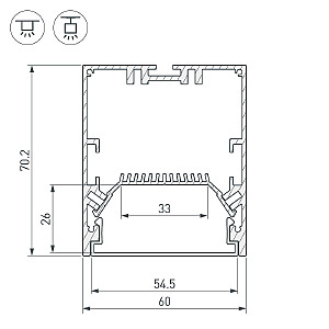 Алюминиевый анодированный профиль для светодиодных лент и линеек. Габаритные размеры (L×W×H): 2000x60x70 мм. Ширина площадки для ленты 33 мм. Отсек для БП 47х29 мм. Экраны, заглушки и другие аксессуары приобретаются отдельно. Цена за 1 метр.
