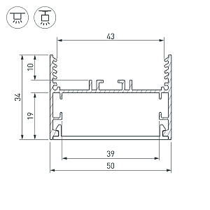 Алюминиевый анодированный профиль для светодиодных лент и линеек. Габаритные размеры (L×W×H): 2000x50x34 мм. Ширина площадки для ленты 38 мм. Экраны, заглушки и другие аксессуары приобретаются отдельно. Цена за 1 метр. При подвесном монтаже может быть оснащён блоком питания.