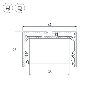 Алюминиевый профиль для светодиодных лент и линеек. Цвет - чёрный RAL9005 (порошковая окраска).Габаритные размеры (L×W×H): 3000x49x32 мм. Ширина площадки для ленты 38 мм. Экраны, заглушки и другие аксессуары приобретаются отдельно. Цена за 1 метр.