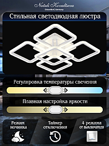 Допускается отличие страны-изготовителя, указанной в характеристиках. Линии производства могут находиться в нескольких государствах. Это не влияет на качество изготовления товара: все заводы данного бренда работают по общим стандартам, а готовые изделия проходят соответствующий контроль.Австрия Коллекция Smart Home ЦветЦвет арматуры Белый Цвет Белый Материал арматуры Металл Цвет плафона Белый Материал плафона Акрил РазмерыВысота (мм) 135 Длина (мм) 550 Ширина (мм) 550 ЭлектрикаКоличество ламп (шт) 1 Цоколь LED Тип лампы Светодиодная Мощность лампы (Вт) 120 Световой поток 9600 Цветовая температура теплый (3300k), 4300, 7000 Площадь освещения 24 Дополнительная информацияСпособ крепления Планка Вес (Кг) 2.1 Техническая оссобеность Ночной режим, Таймер, Регулировка яркости, Полностью светодиодная, Регулировка цветовой температуры Тип управления Пульт ДУ, Управление смартфоном, WI-Fi, Голосовое управление -