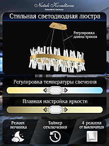 Современный светодиодный светильник нимб украсит любое помещение за счёт инновационного дизайна и большой функциональности. Светильник имеет овальную форму шириной в 80 см. По периметру располагается гранённый хрусталь под наклоном, который придаёт изысканности и подчеркивает стилистику. Высота люстры регулируется. Также люстра оснащена дистанционным управлением через пульт ДУ, смартфон, планшет. Люстра имеет тёплый, естественный и холодный свет с регулировкой температуры свечения. Обладает плавной настройкой яркости в диапазоне от 10% до 100%. Имеется режим ночника и таймер отключения. Кроме того, от стандартного выключателя люстра имеет 4 режима свечения. Данные функции делают светильник оптимальным в процессе использования. Общая мощность 120W со световым потоком 7900 lm позволяет осветить до 20 кв.м. Он прост в сборке, установке и экономичен в обслуживании. Светодиоды легко заменимы в случае перегорания. Люстра подойдёт для всех видов потолков. Цветовая температура настраивается от 2700 до 7000 K. Степень защиты 20 IP.