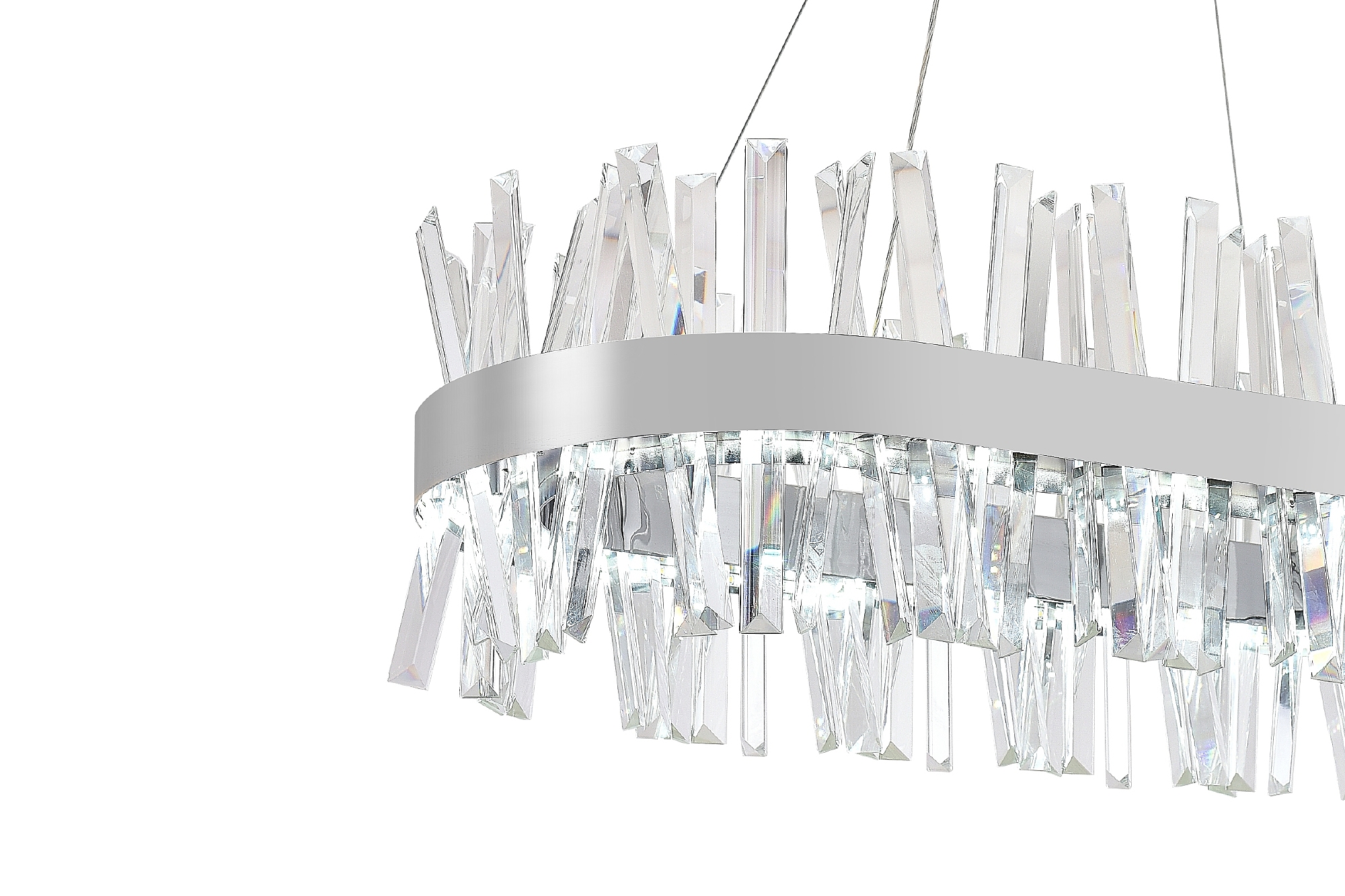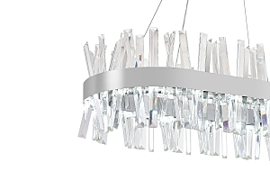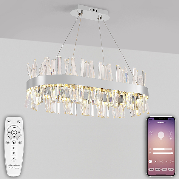 Современный светодиодный светильник нимб украсит любое помещение за счёт инновационного дизайна и большой функциональности. Светильник имеет овальную форму шириной в 80 см. По периметру располагается гранённый хрусталь под наклоном, который придаёт изысканности и подчеркивает стилистику. Высота люстры регулируется. Также люстра оснащена дистанционным управлением через пульт ДУ, смартфон, планшет. Люстра имеет тёплый, естественный и холодный свет с регулировкой температуры свечения. Обладает плавной настройкой яркости в диапазоне от 10% до 100%. Имеется режим ночника и таймер отключения. Кроме того, от стандартного выключателя люстра имеет 4 режима свечения. Данные функции делают светильник оптимальным в процессе использования. Общая мощность 120W со световым потоком 7900 lm позволяет осветить до 20 кв.м. Он прост в сборке, установке и экономичен в обслуживании. Светодиоды легко заменимы в случае перегорания. Люстра подойдёт для всех видов потолков. Цветовая температура настраивается от 2700 до 7000 K. Степень защиты 20 IP.