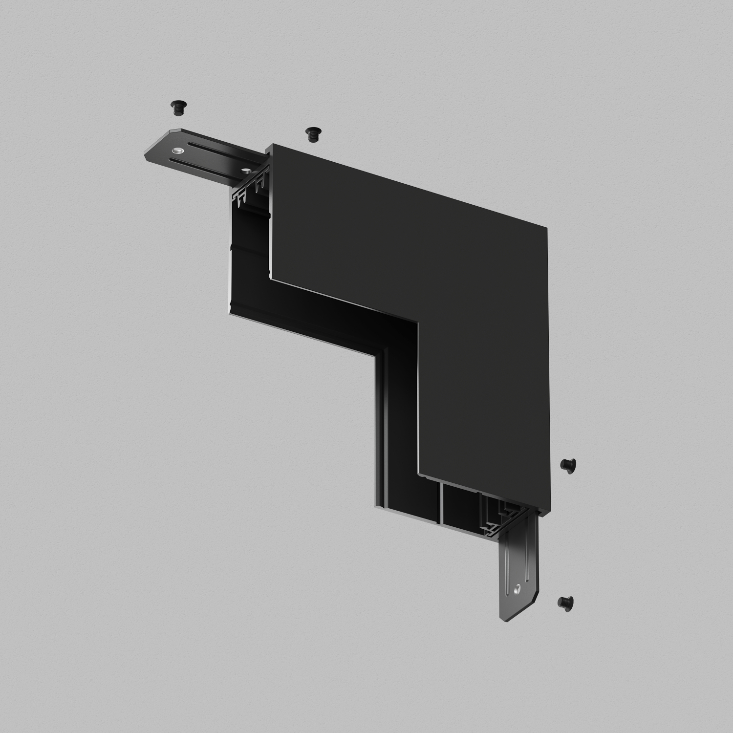 Угловой механический соединитель трека SMART, накладной монтаж. Предназначен для перехода стена-потолок. Гибкий электрический коннектор арт. TR2103 приобретается отдельно. Две металлические соединительные пластины, служащие для крепления трека и углового элемента входят в комплект поставки,