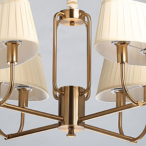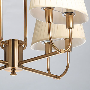 Металлическое основание гальванизировано в цвет меди. Заменяемые источники света закрыты двойными текстильными абажурами бежевого цвета, отделанными кантами сверху и снизу.