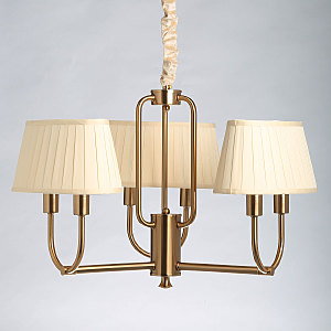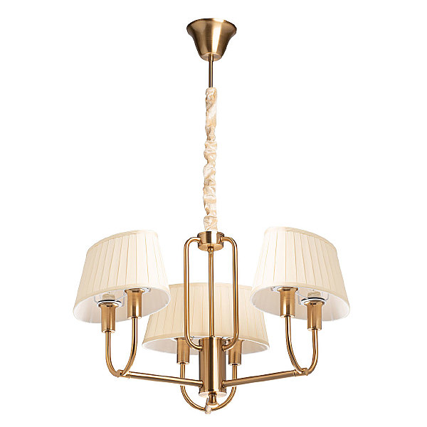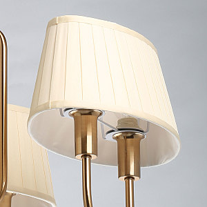 Металлическое основание гальванизировано в цвет меди. Заменяемые источники света закрыты двойными текстильными абажурами бежевого цвета, отделанными кантами сверху и снизу.
