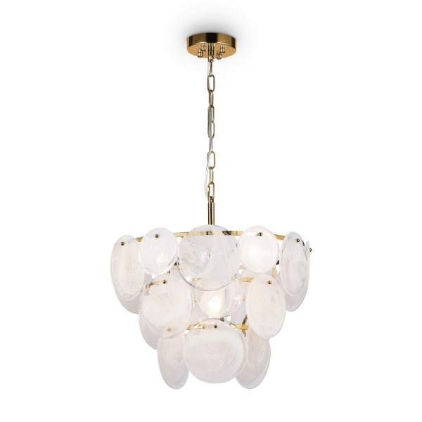 Оригинальный декор серии Sophia создает эффектный и запоминающийся визуальный образ. Металлическая арматура окрашена в два оттенка на выбор: латунь и хром. Источники света обрамляет многоуровневый и разноразмерный стеклянный декор. Прозрачные пластины с вкраплениями белого стекла создают эффект замороженной фактуры. Композиция кажется воздушной и легкой, а световой поток, проходя сквозь фактурную поверхность, дает атмосферную подсветку. Модель предназначена для комнат, оформленных в стиле ар-деко, модерн, неоклассика. Подвесные люстры на 5 ламп и бра обеспечат комплексное освещение интерьера в единой стилистике.