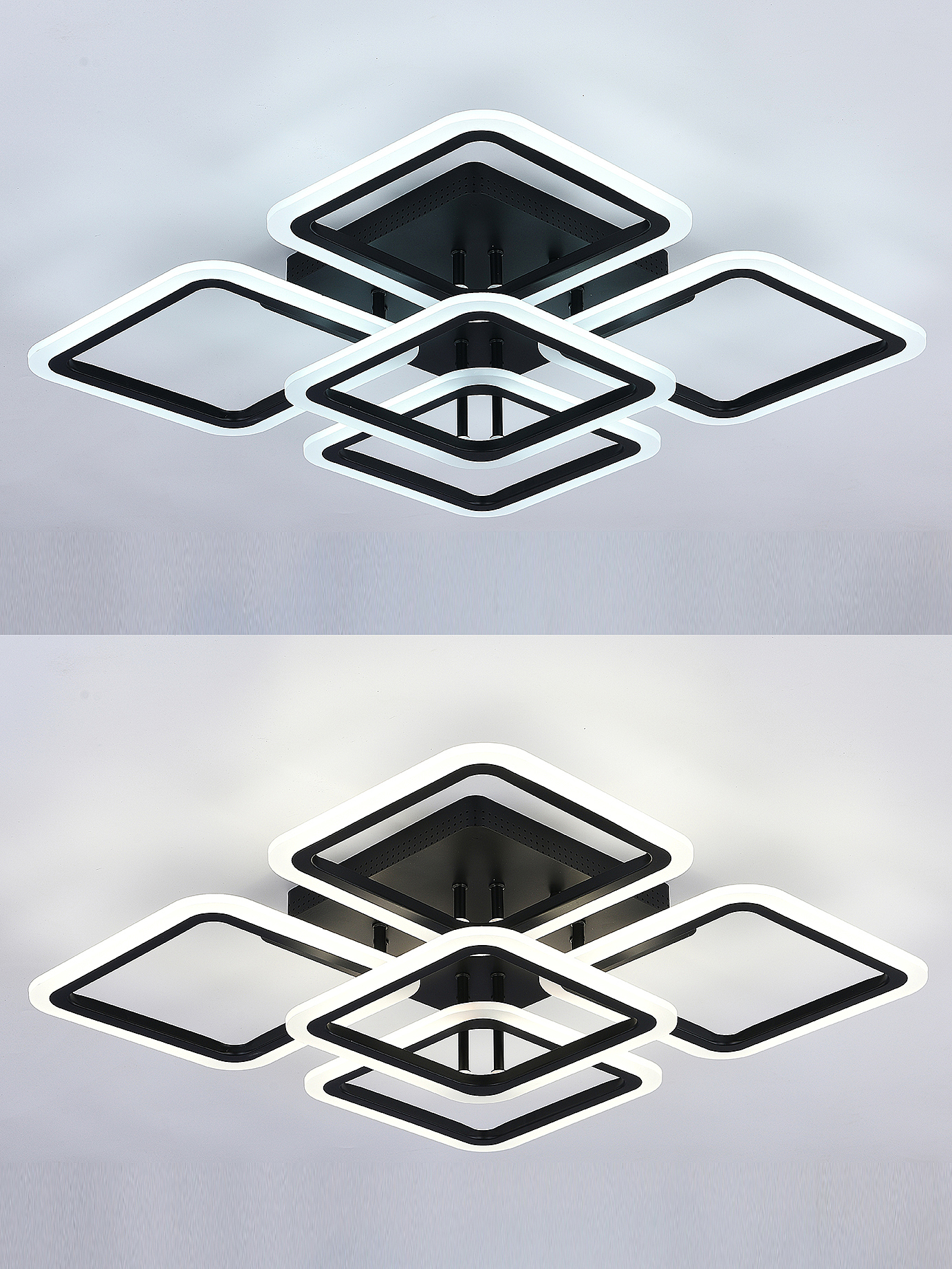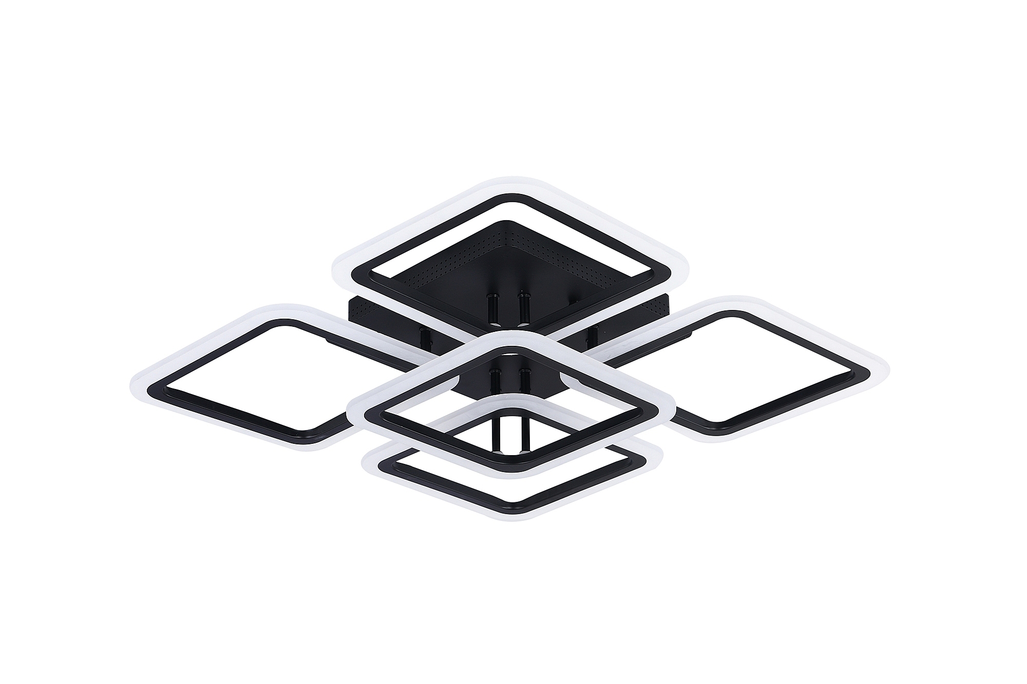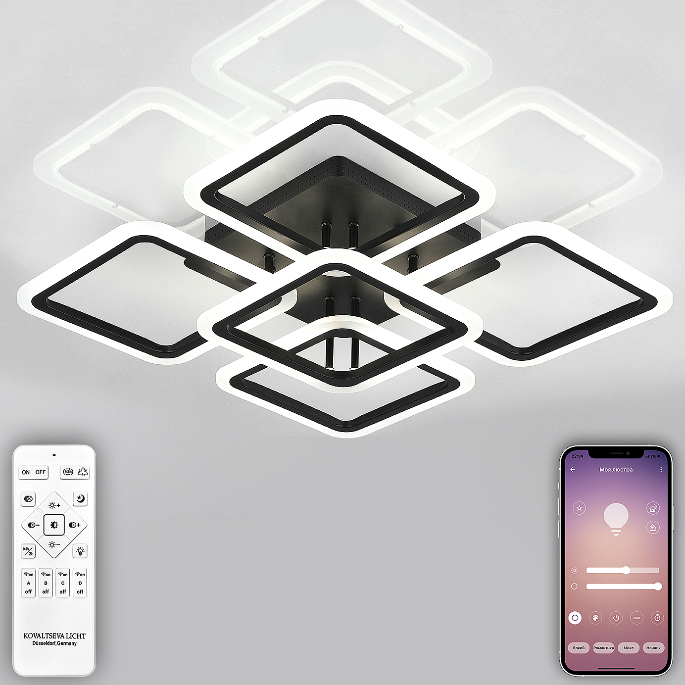 Светодиодный светильник с дистанционным управлением через пульт ДУ, смартфон, планшет. Лицевую часть составляют пять симметричных квадратов, расположенные на двух уровнях. По их периметру расположена подсветка, акрил обеспечивает отличное рассеивание света. Дизайн люстры выполнен в современном стиле в чёрном цвете и отлично подойдёт в любой интерьер. Люстра имеет тёплый, естественный и холодный свет с регулировкой температуры свечения. Обладает плавной настройкой яркости в диапазоне от 10% до 100%. Имеется режим ночника и таймер отключения. Кроме того, от стандартного выключателя люстра имеет 4 режима свечения. Данные функции делают светильник оптимальным в процессе использования. Общая мощность 140W со световым потоком 9600 lm позволяет осветить до 24 кв.м. Он прост в сборке, установке и экономичен в обслуживании.Люстра подойдёт для всех видов потолков. Цветовая температура настраивается от 3000 до 6500 K. Степень защиты 20 IP.
