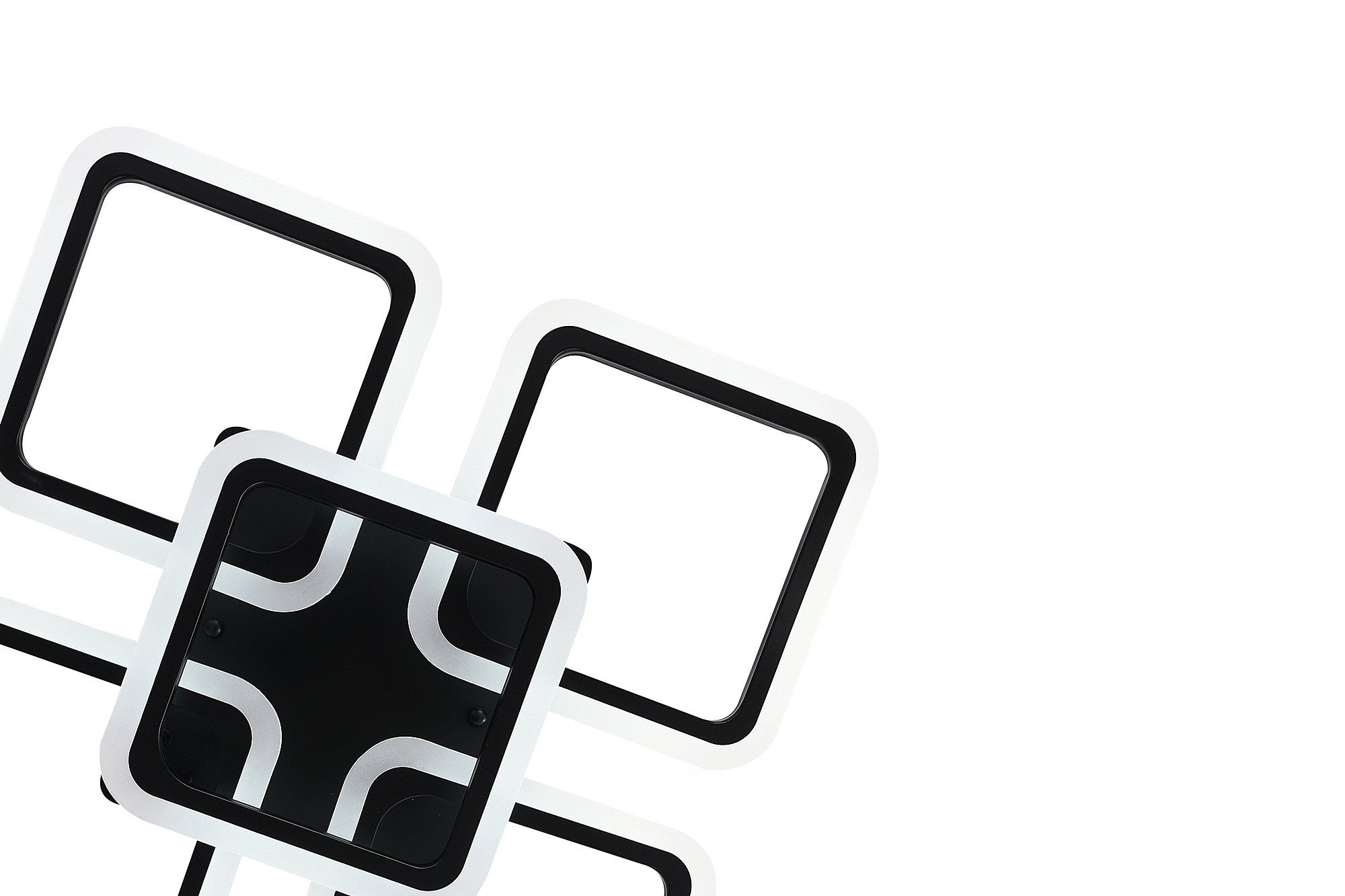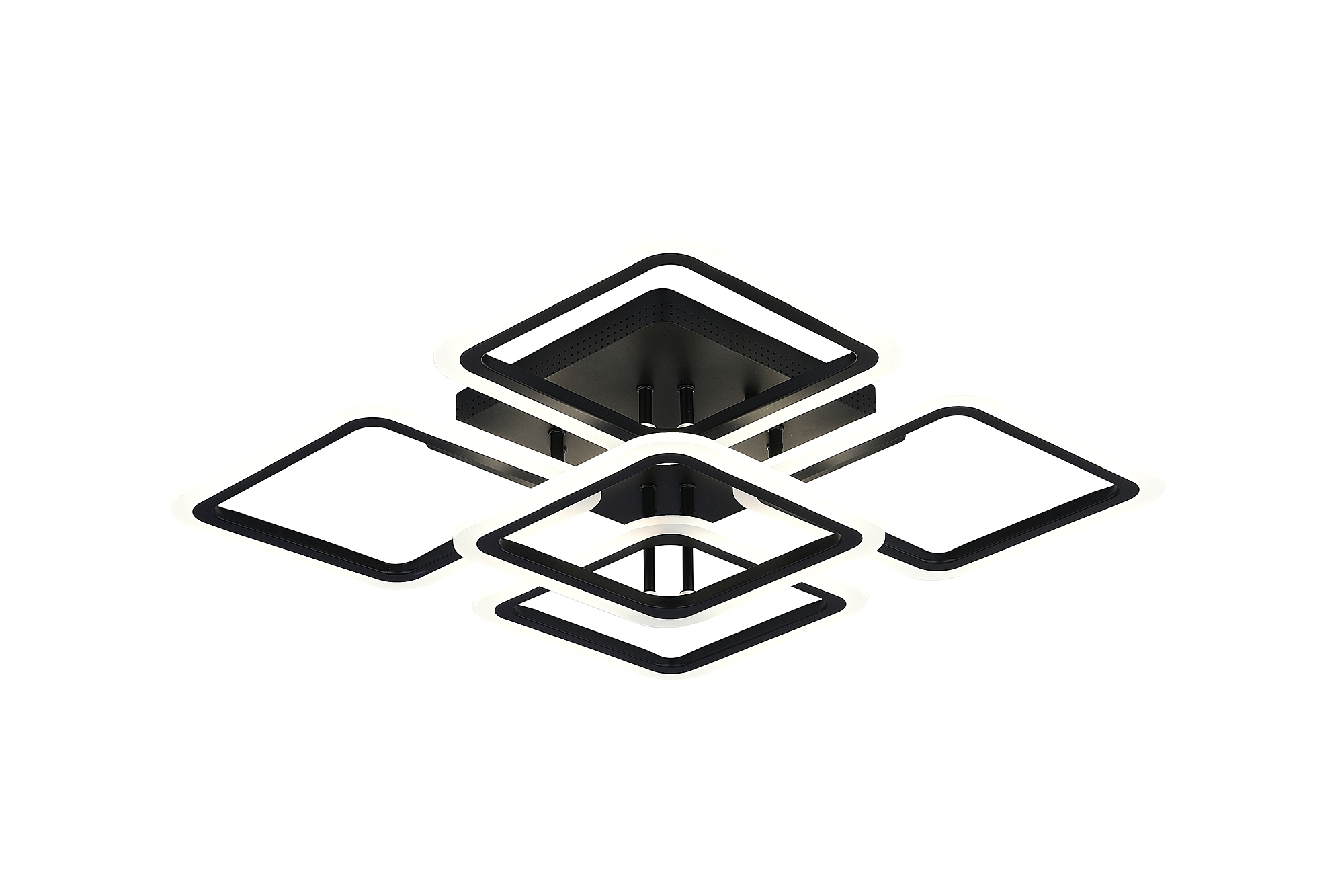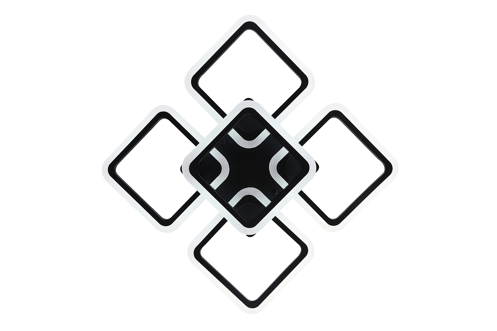 Светодиодный светильник с дистанционным управлением через пульт ДУ, смартфон, планшет. Лицевую часть составляют пять симметричных квадратов, расположенные на двух уровнях. По их периметру расположена подсветка, акрил обеспечивает отличное рассеивание света. Дизайн люстры выполнен в современном стиле в чёрном цвете и отлично подойдёт в любой интерьер. Люстра имеет тёплый, естественный и холодный свет с регулировкой температуры свечения. Обладает плавной настройкой яркости в диапазоне от 10% до 100%. Имеется режим ночника и таймер отключения. Кроме того, от стандартного выключателя люстра имеет 4 режима свечения. Данные функции делают светильник оптимальным в процессе использования. Общая мощность 140W со световым потоком 9600 lm позволяет осветить до 24 кв.м. Он прост в сборке, установке и экономичен в обслуживании.Люстра подойдёт для всех видов потолков. Цветовая температура настраивается от 3000 до 6500 K. Степень защиты 20 IP.