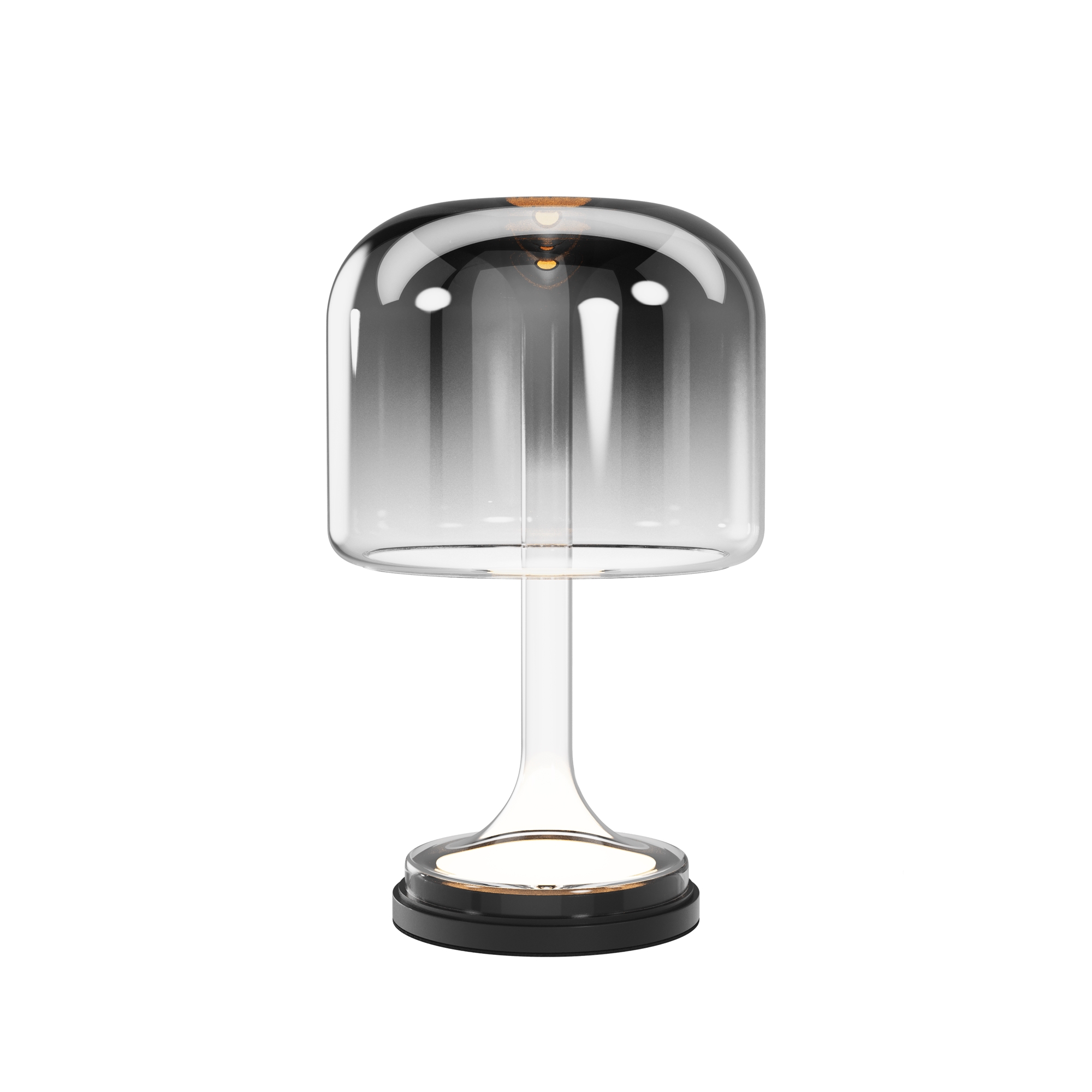 Материал арматуры и плафонов - литое стекло, цвет - градиентный черный, золотой и белый. Фактура поверхностей гладкая. Источник света: LED. Цветовая температура светильника 3000К, угол рассеивания света 120градусов. На проводе расположен тач-сенсор, при длительном нажатии световой поток меняет свою мощность (диммируется). Отражаясь от стекла, свет стремится вниз, создавая визуальный эффект парения плафона в воздухе.