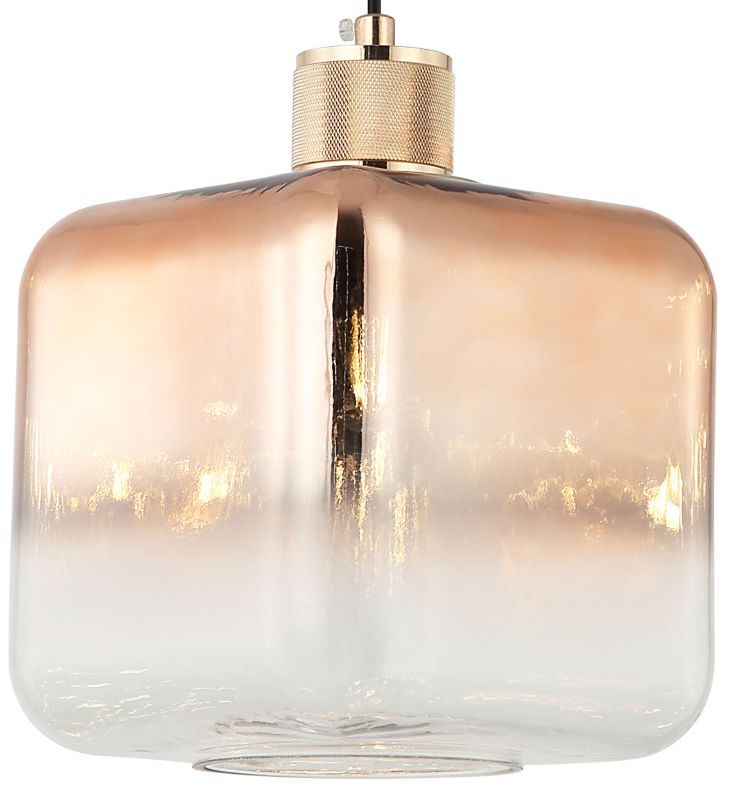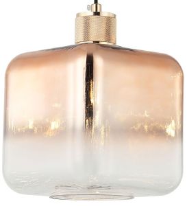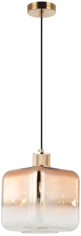 Одиночный подвес из серии Square имеет металлическую арматуру, гальванизированную в цвет бронзы и декорирован прямоугольным плафоном из оплавленного стекла, частично гальванизированном в цвет золота. На подвесе дополнительно используется металлический фактурный декоративный элемент, гальванизированный в цвет арматуры.