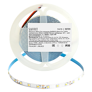 Лента светодиодная 12V SAFFIT SST01 , 60*SMD2835, 6W/m, IP20, 6500К (холодный белый), Кратность резки мм 50мм, 5000*8 *1,22мм