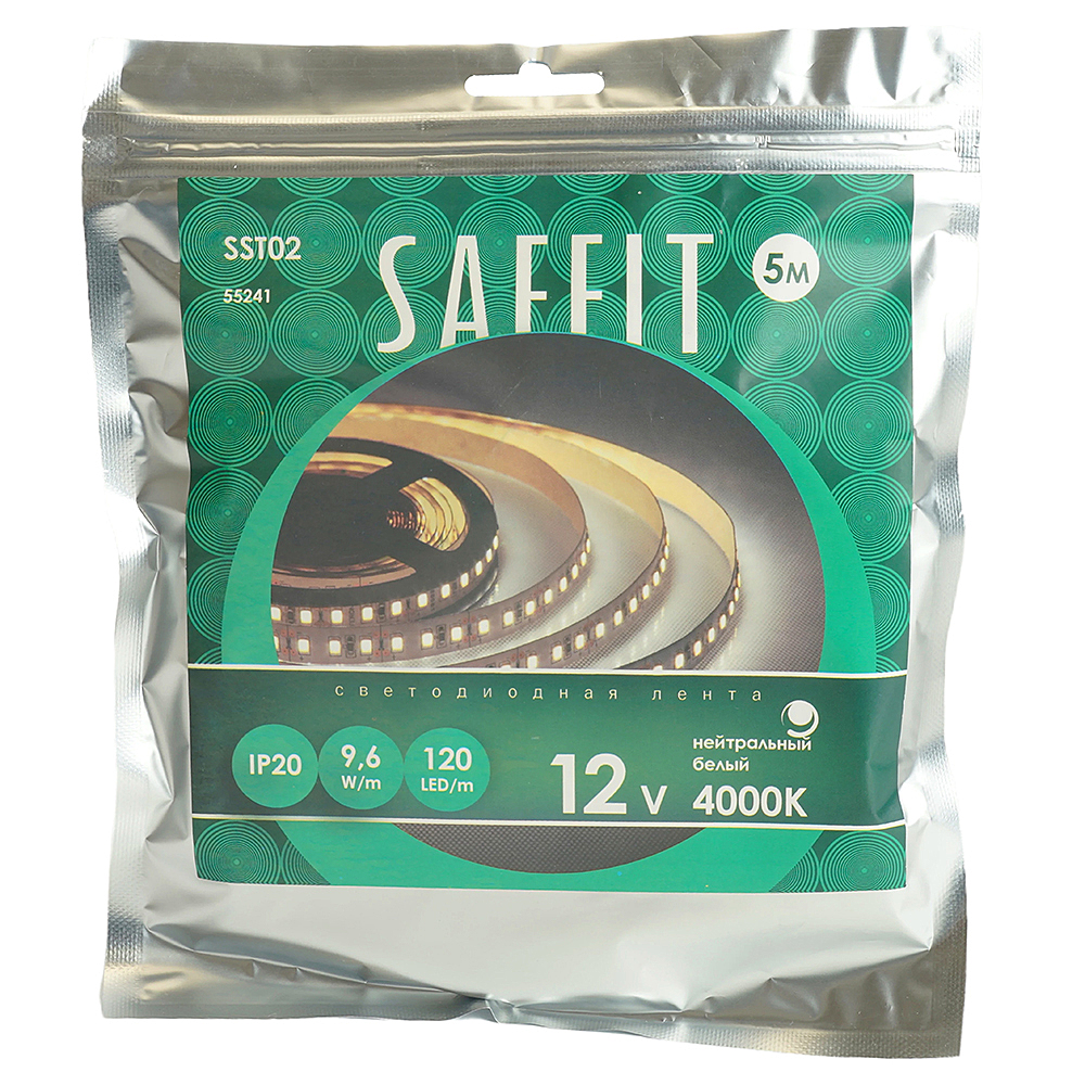 Лента светодиодная 12V SAFFIT SST02 , 120*SMD2835, 9,6W/m, IP20, 4000К (нейтральный белый), Кратность резки мм 25 мм, 5000 *8*1,22мм