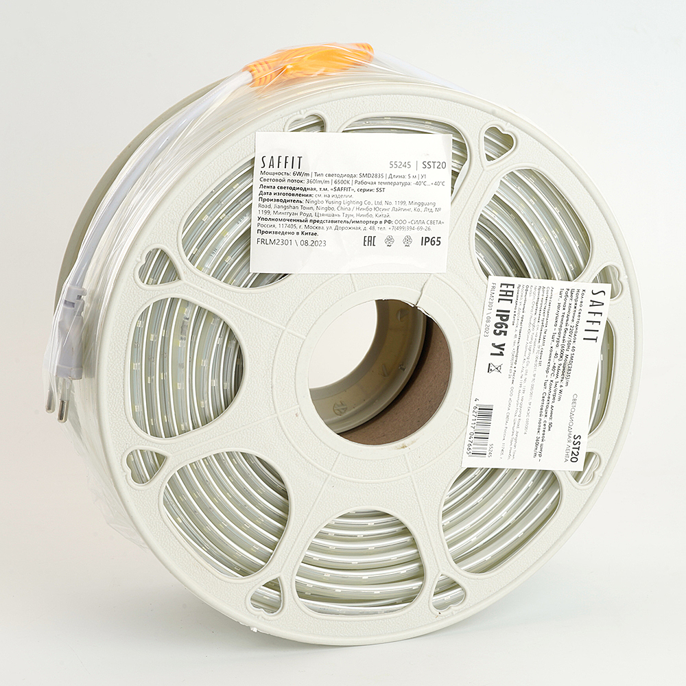 Лента светодиодная 220V SAFFIT SST20 , 60*SMD2835, 6W/m, IP65, 6500К (холодный белый), в комплекте сетевой шнур, Кратность резки мм 1000мм, раб.t -40градусовC...+40градусовC, бобина 50 метров*9мм*6 мм