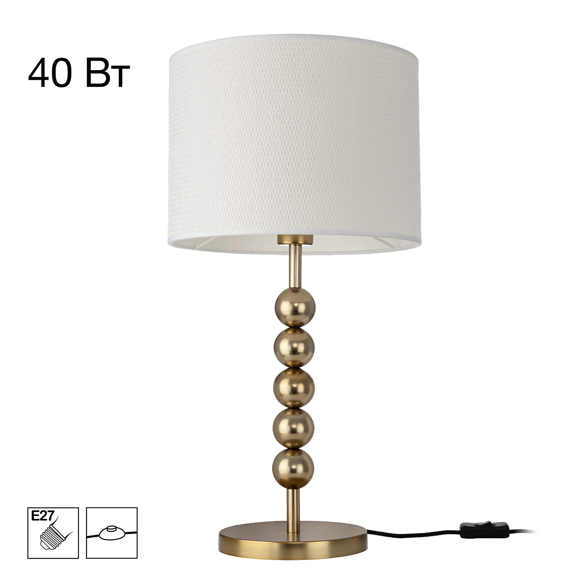 Допускается отличие страны-изготовителя, указанной в характеристиках. Линии производства могут находиться в нескольких государствах. Это не влияет на качество изготовления товара: все заводы данного бренда работают по общим стандартам, а готовые изделия проходят соответствующий контроль.Дания Коллекция Status ЦветЦвет арматуры Золото Цвет Золото Материал арматуры Металл Цвет плафона Белый Материал плафона Текстиль РазмерыВысота (мм) 575 Диаметр (мм) 300 Ширина (мм) 300 ЭлектрикаКоличество ламп (шт) 1 Цоколь E27 Тип лампы Накаливания, Светодиодные, Компактные люмин. Мощность лампы (Вт) 40 Общая мощность (Вт) 40 Световой поток 400 Площадь освещения 2 Дополнительная информацияСтепень защиты (IP) IP20 Тип выключателя Выключатель на шнуре -