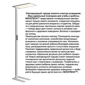 Светодиодный торшер полного спектра освещения - Ваш идеальный помощник для учебы и работы. NOVOTECH представляет инновационный светодиодный торшер нового поколения, созданный специально для детей школьного возраста и студентов. Забудьте о традиционных настольных лампах прошлого века - теперь ваши дети смогут учиться в условиях комфортного и здорового освещения, близкого к природному солнцу. Преимущества полного спектра: Полноценно имитирует солнечное излучение, способствуя концентрации внимания и снижению утомляемости глаз. Минимизирует нагрузку на зрение ребенка благодаря равномерному распределению яркости и отсутствию мерцания. Помогает поддерживать правильный режим сна и бодрствования, положительно влияя на самочувствие школьника. Идеальное решение для учебного процесса! Новый светодиодный торшер станет незаменимым помощником при выполнении домашних заданий, чтении книг и подготовке к экзаменам. Позаботьтесь о здоровье своего ребёнка прямо сейчас, подарив ему возможность учиться в оптимальных условиях.