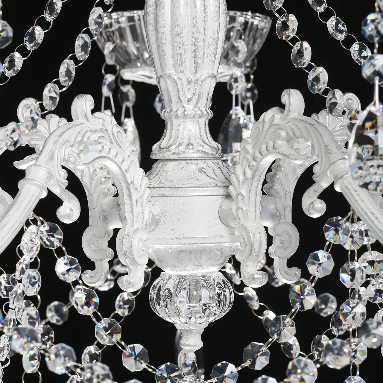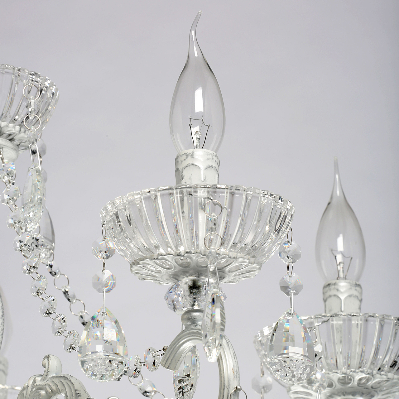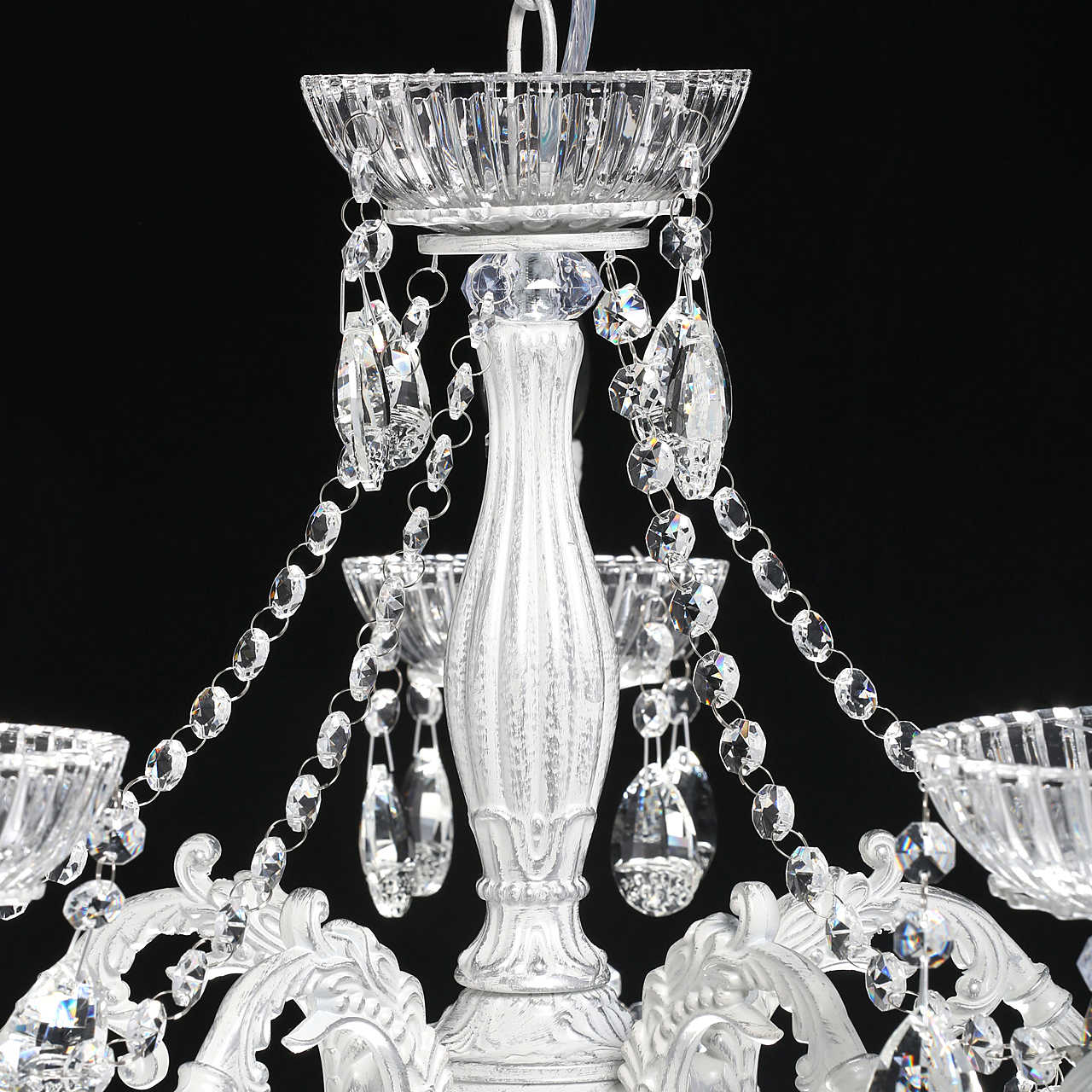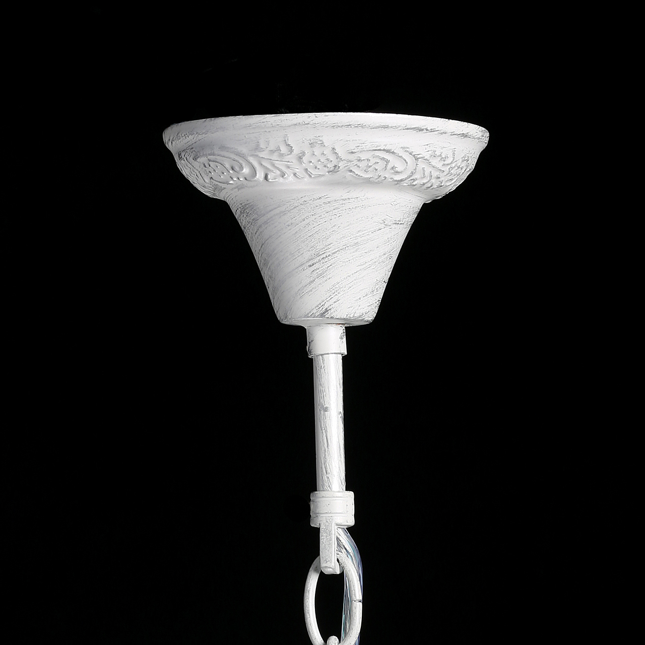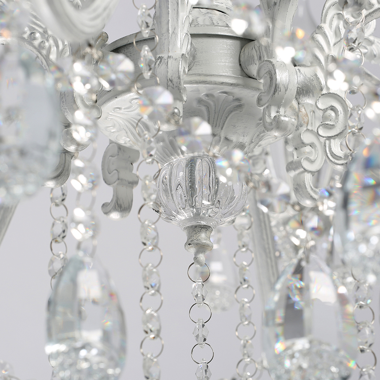 Классическая форма рожков-свечей с основанием белого цвета с серебристой патиной.Большое количество хрустальных элементов добавляют светильнику нарядности.Розетки из фактурного стекла придают легкости модели.Возможность регулировать высоту светильника за счет звеньев цепи.