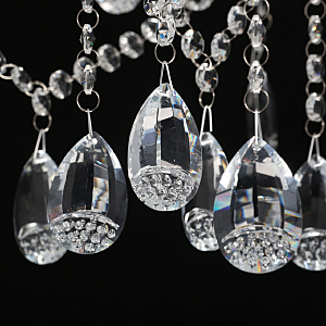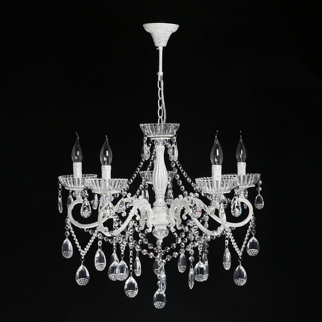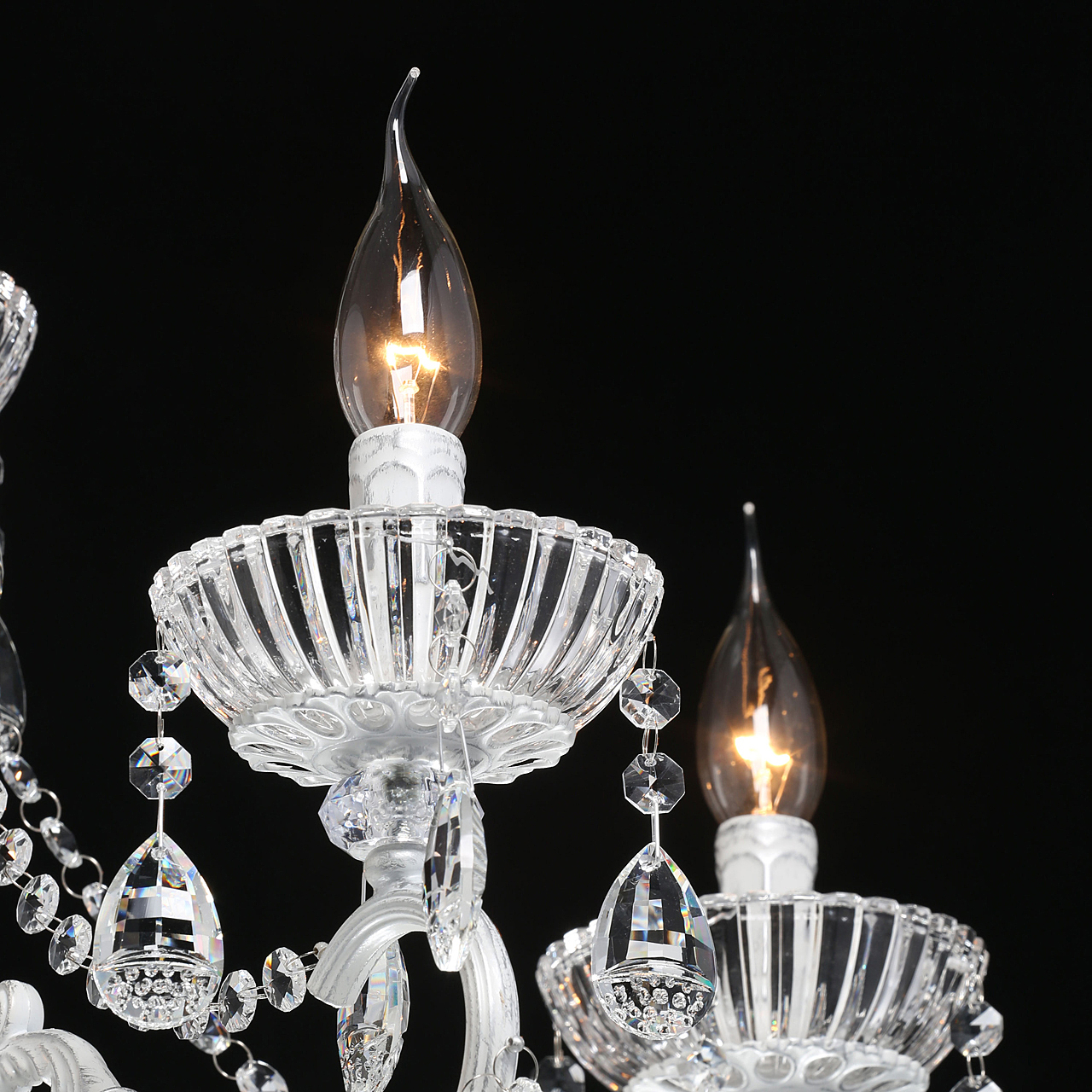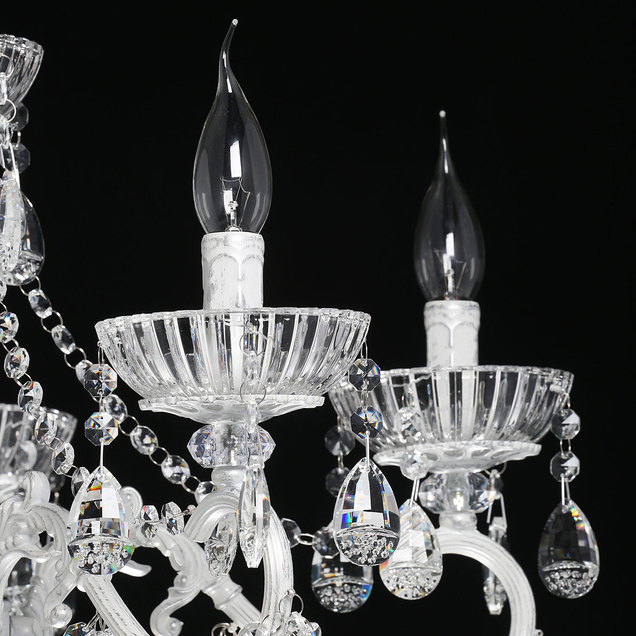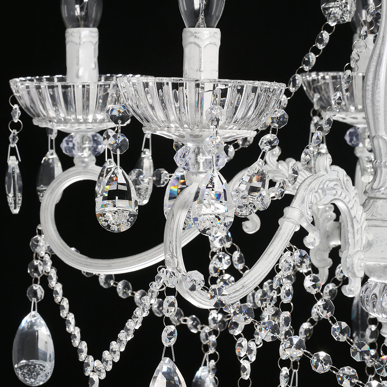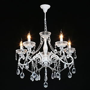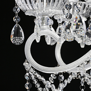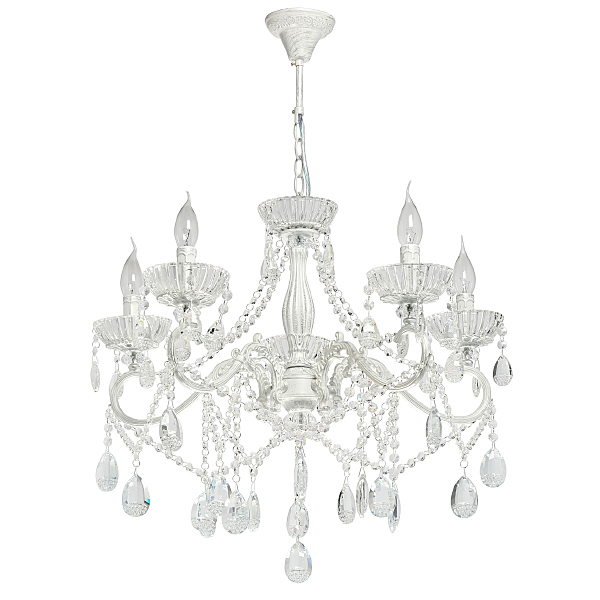 Классическая форма рожков-свечей с основанием белого цвета с серебристой патиной.Большое количество хрустальных элементов добавляют светильнику нарядности.Розетки из фактурного стекла придают легкости модели.Возможность регулировать высоту светильника за счет звеньев цепи.
