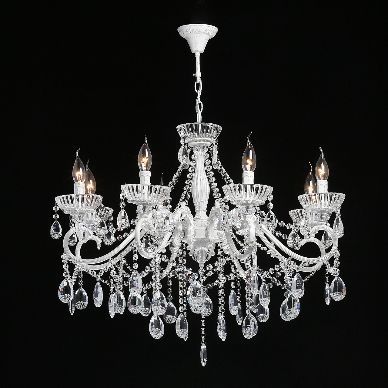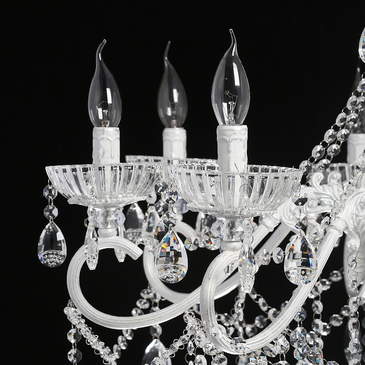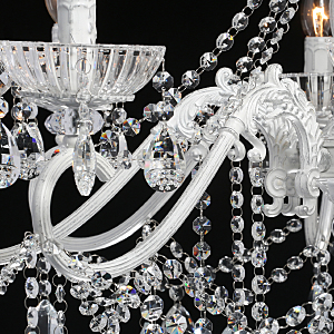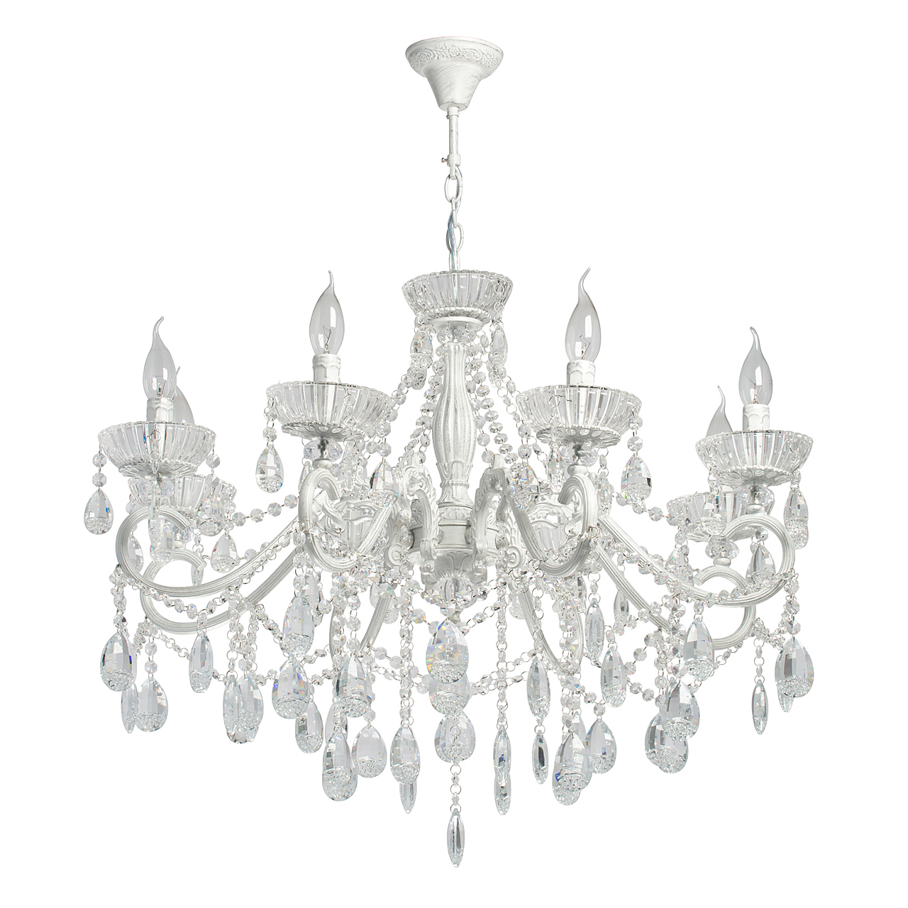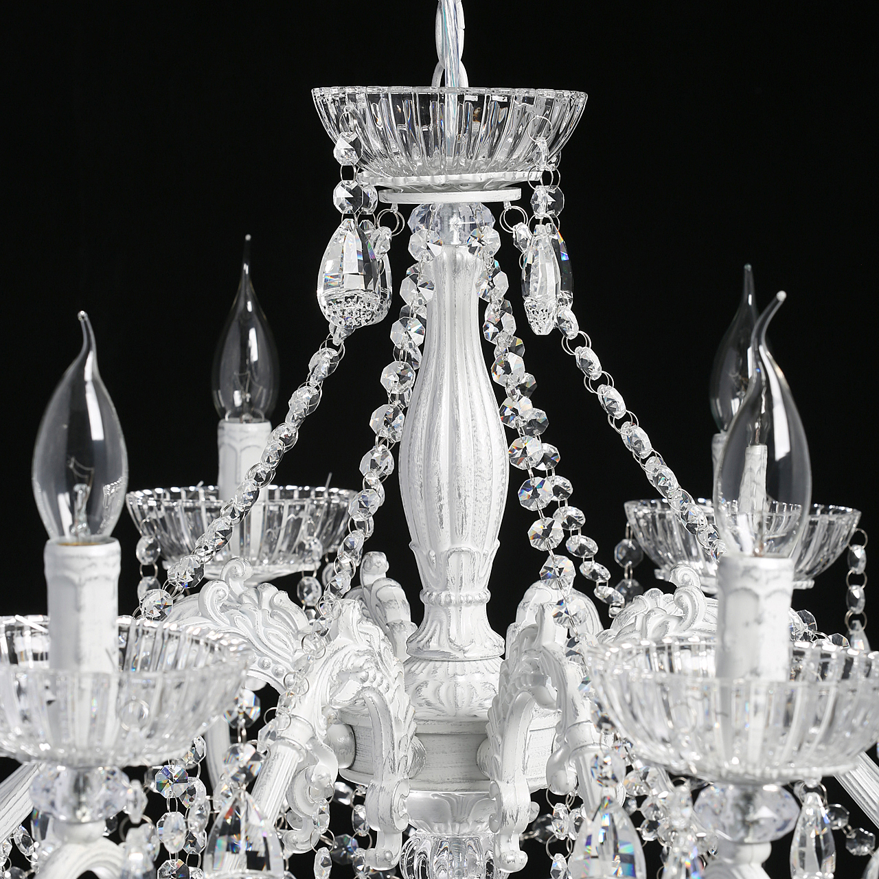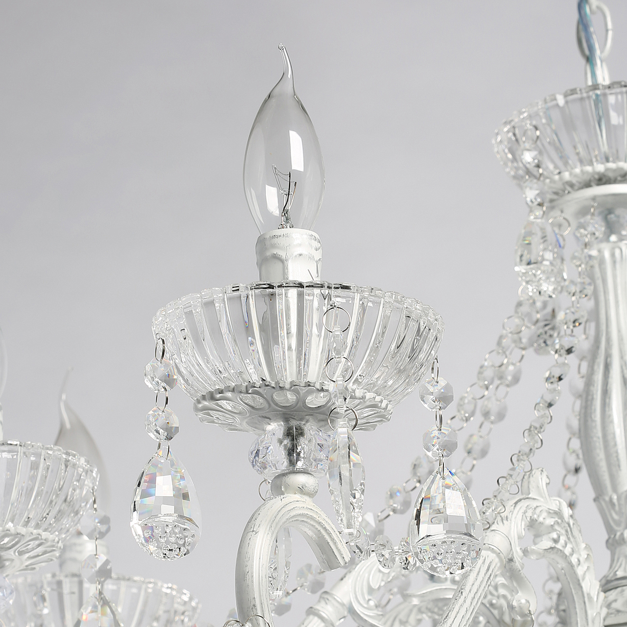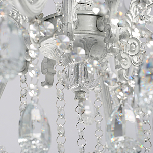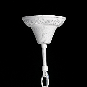 Классическая форма рожков-свечей с основанием белого цвета с серебристой патиной.Большое количество хрустальных элементов добавляют светильнику нарядности.Широкий диаметр светильника обеспечивает высокие параметры освещенности.Розетки из фактурного стекла придают легкости модели.Возможность регулировать высоту светильника за счет звеньев цепи.Широкий диаметр обеспечивает высокие параметры освещенности.