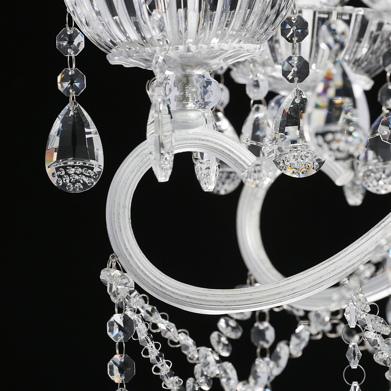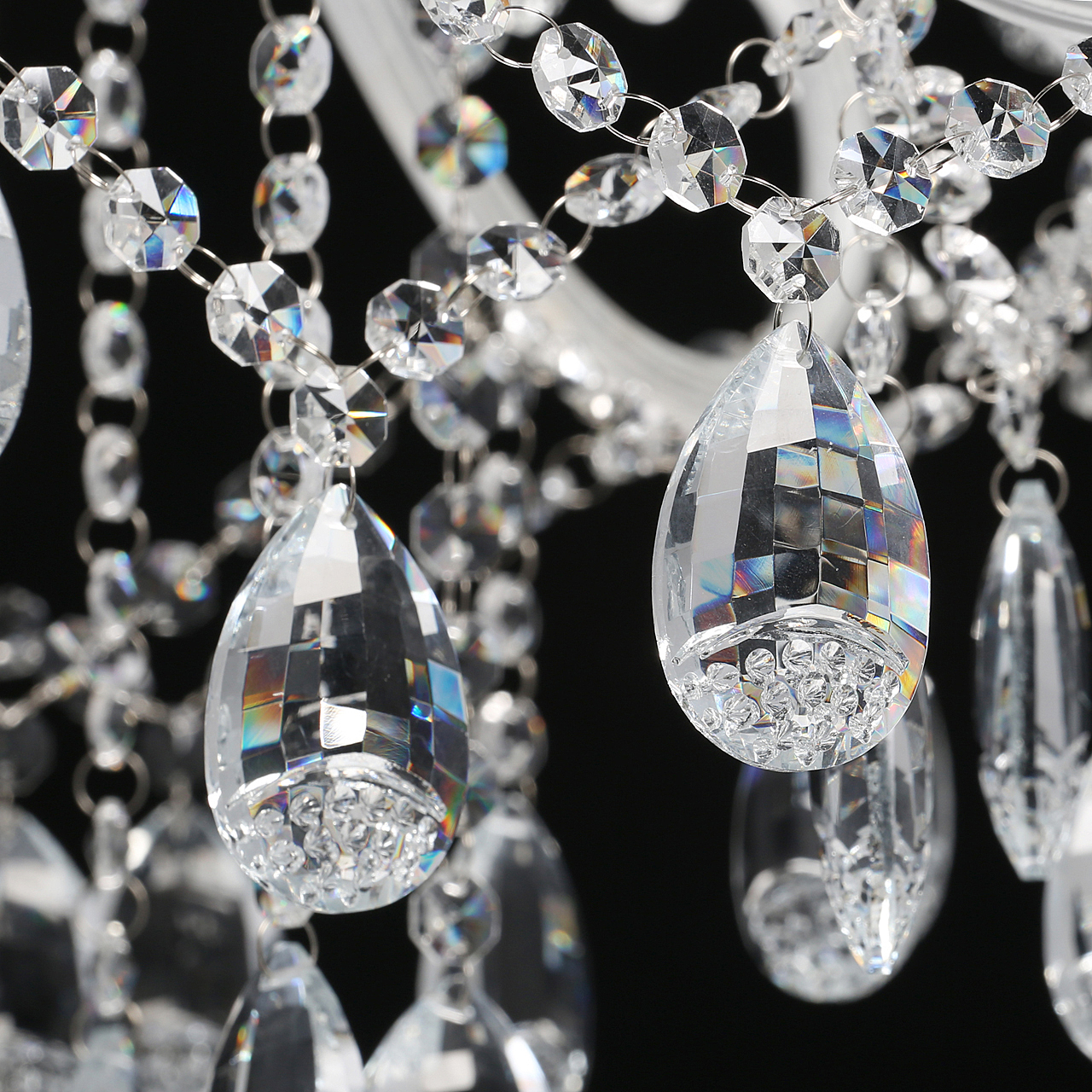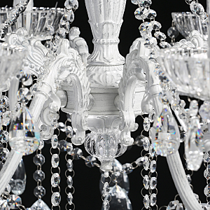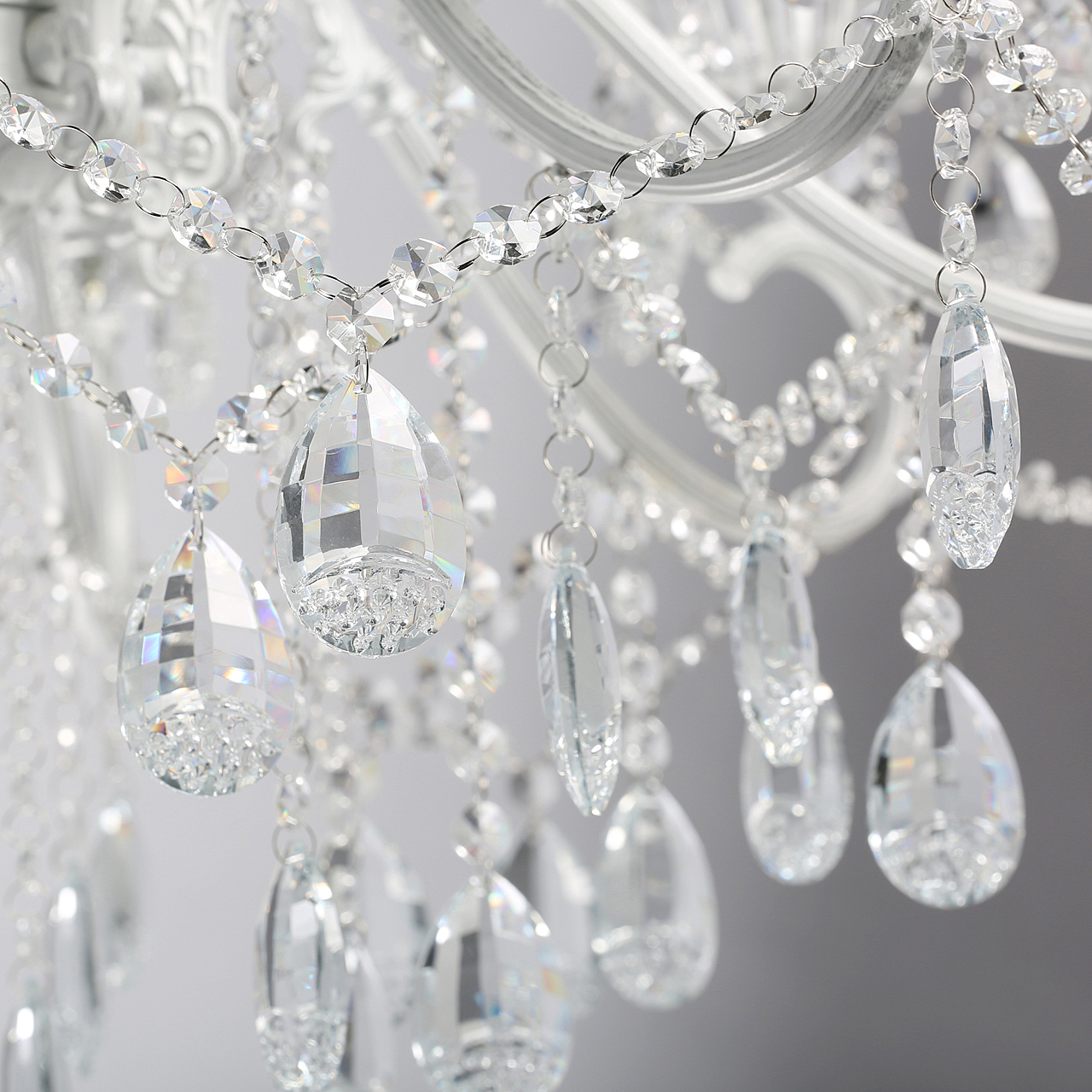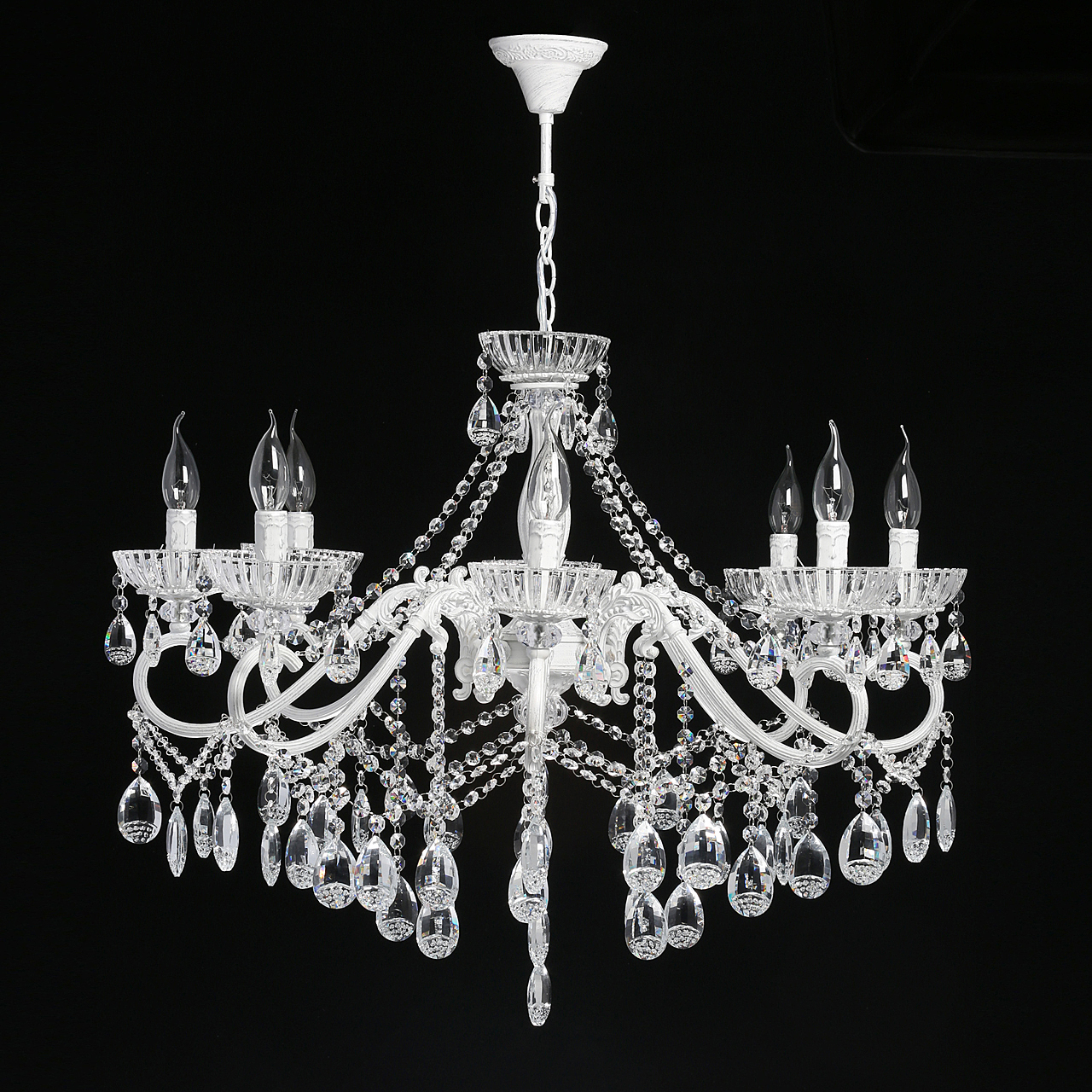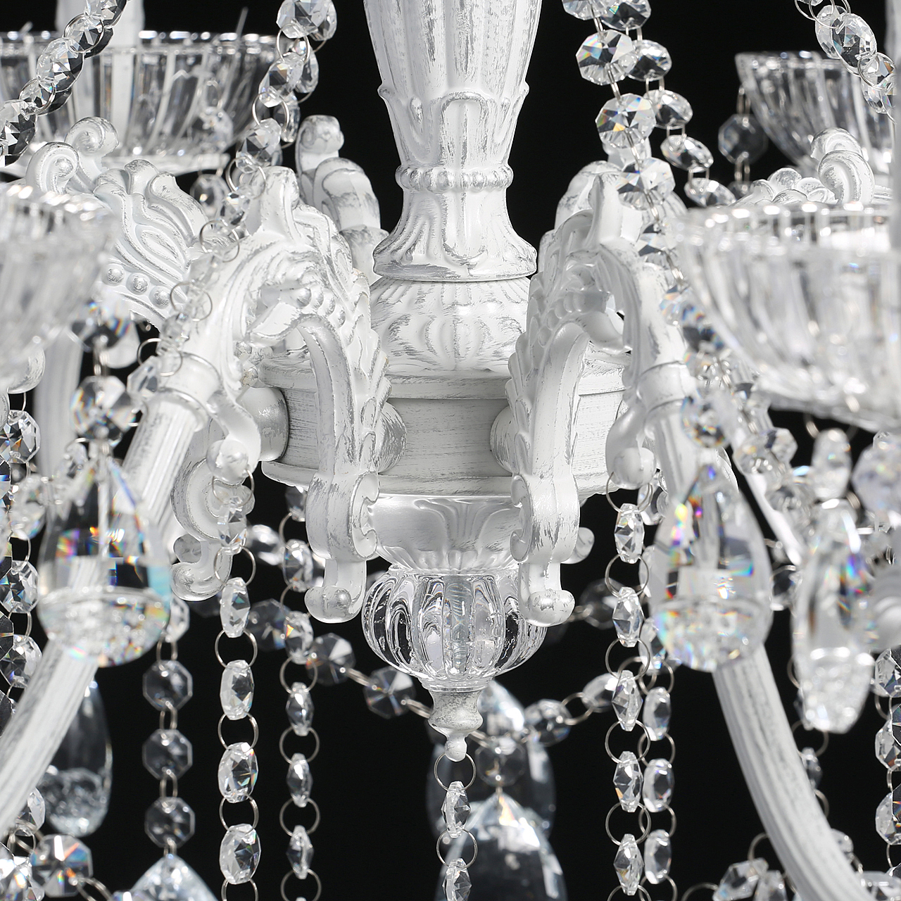 Классическая форма рожков-свечей с основанием белого цвета с серебристой патиной.Большое количество хрустальных элементов добавляют светильнику нарядности.Широкий диаметр светильника обеспечивает высокие параметры освещенности.Розетки из фактурного стекла придают легкости модели.Возможность регулировать высоту светильника за счет звеньев цепи.Широкий диаметр обеспечивает высокие параметры освещенности.