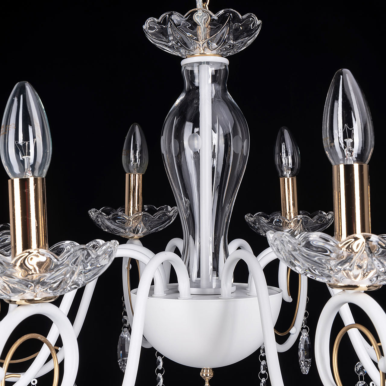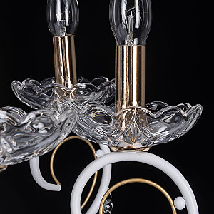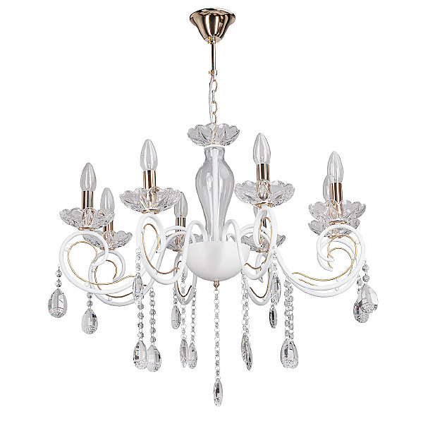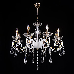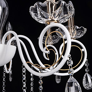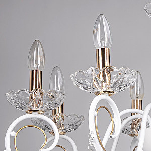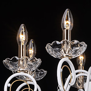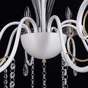 Сочетание белого с золотом смотрится торжественно, а отсутствие лишних деталей дарит ощущение свободного пространства и легкости. Тонкие рожки изогнуты в оригинальные завитки.Декор из прозрачного хрусталя разной формы красиво преломляет свет.Особенность модели - в отсутствии привычных плафонов, вместо них используются лампы накаливания, имитирующие огонь свечи. Центральная ось и рожки декорированы стеклянными элементами ручной работы, что придает подвесной люстре индивидуальности.Возможность регулировать комфортную высоту.Заменяемые источники света удобны в эксплуатации.