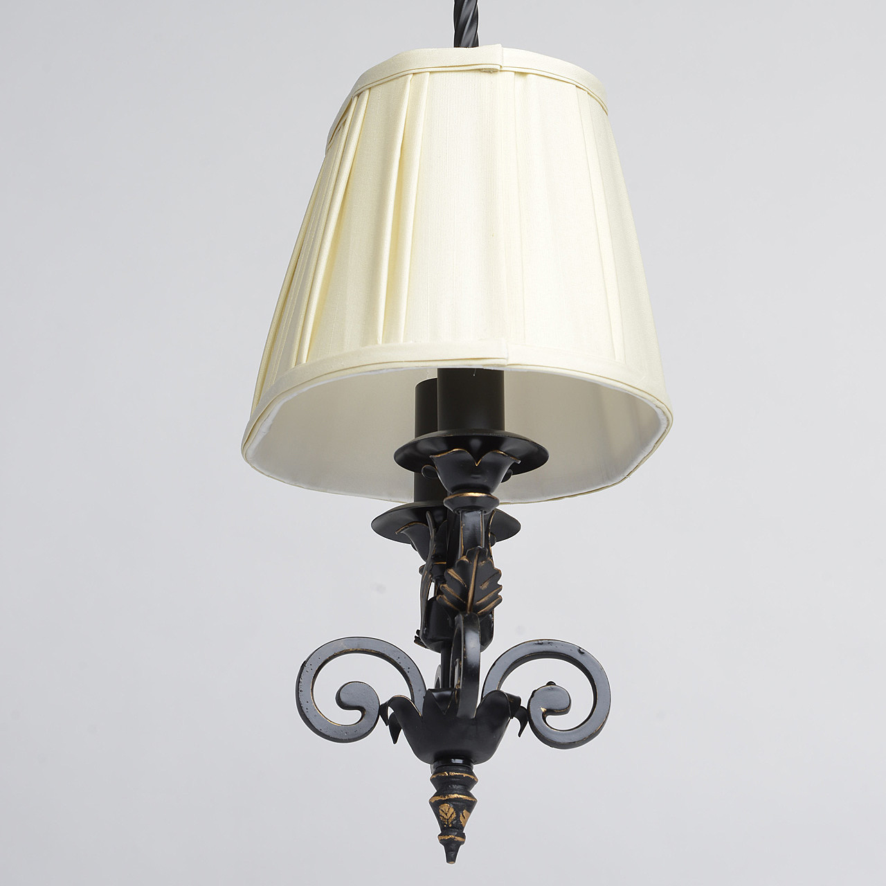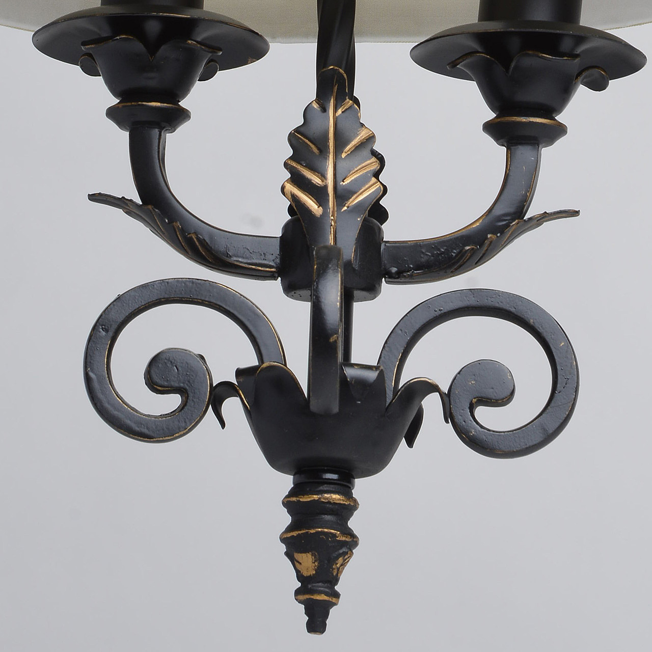 В очертаниях форм светильника Виктория присутствует романская строгость и массивность монументального произведения. Это ощущение достигается благодаря матово-чёрному кованому основанию, выполненному из качественного металла. Арматура изготовлена по сложны
