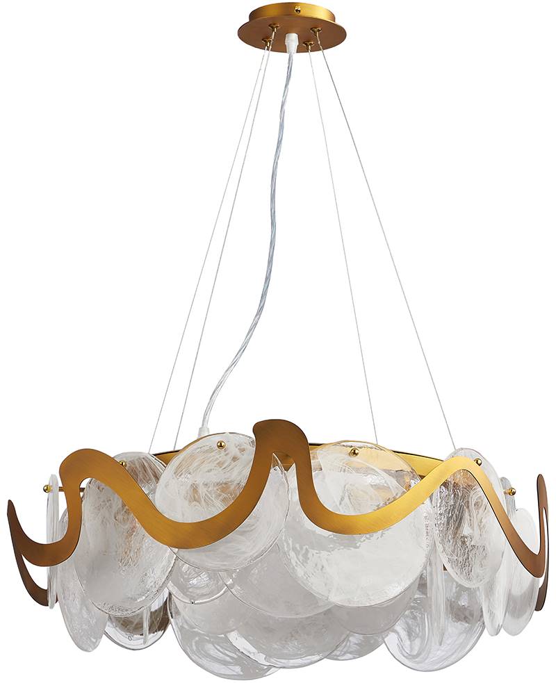 Люстра подвесная из коллекции Sweet выполнена из металла, гальванизированного в цвет матового золота, и декорирована металлической волнистой лентой, гальванизированной в цвет арматуры, и круглыми пластинами из алебастрового стекла, напоминающими парящие облака. Современная форма и высокое качество светильников идеально подойдут как в классические, так и современные интерьеры.